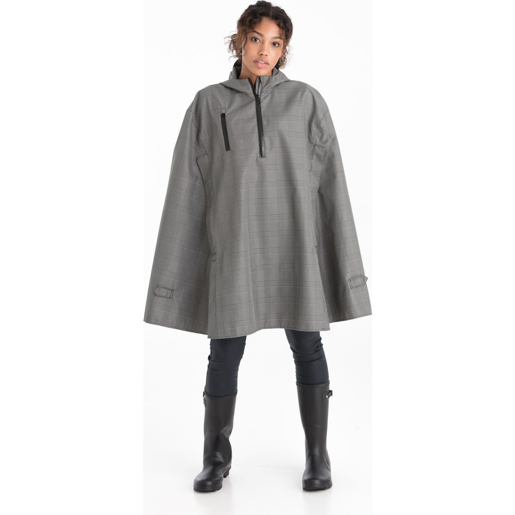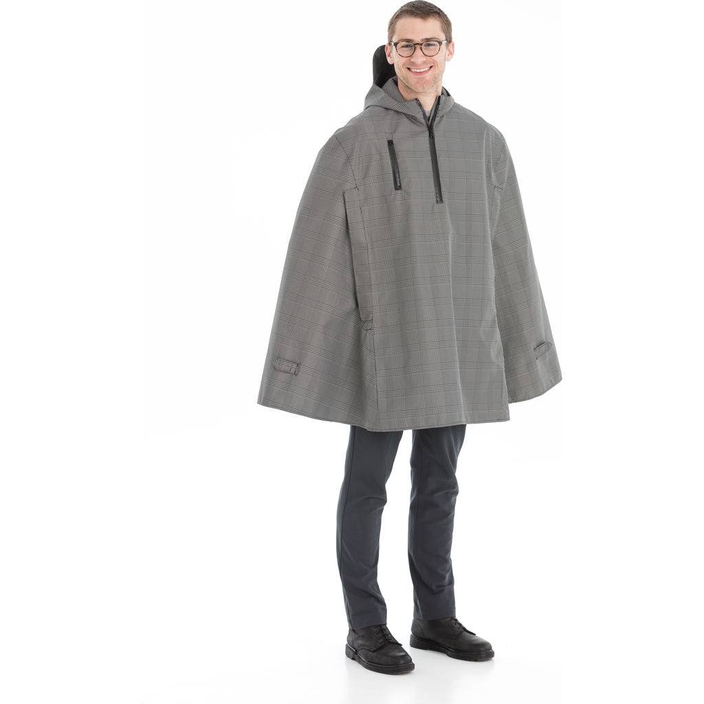 Interwoven with reflective thread, the Houndstooth Electric Rain Cape makes use of a stunningly bright grid to stand out on rainy nights. Each Electric Cleverhood is made out of durable, waterproof 10K mm polyester, carefully crafted and tightly seam-sealed. Featuring a YKK zipper, armholes with magnetic closure and velcro wind tabs to brace the hood during gusts. The very same hood optimizes peripheral vision and can fit underneath a bike helmet easily.