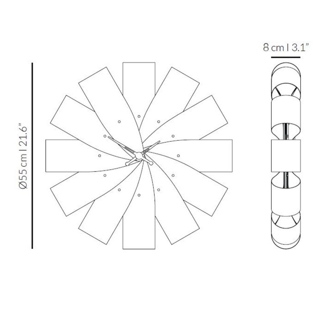 A charming addition to minimalist spaces in need of more natural notes, the Ciclo Wall Clock by Nomon stands out. Straight wooden strips bent at their center points create a rounded face, creating wedge-shaped gaps between each strip and adding a color contrast to the wooden face. This design choice stylishly highlights the hands and small rounded pips that stand out slightly from the smooth ribbon face to mark the hour, creating something truly unforgettable.