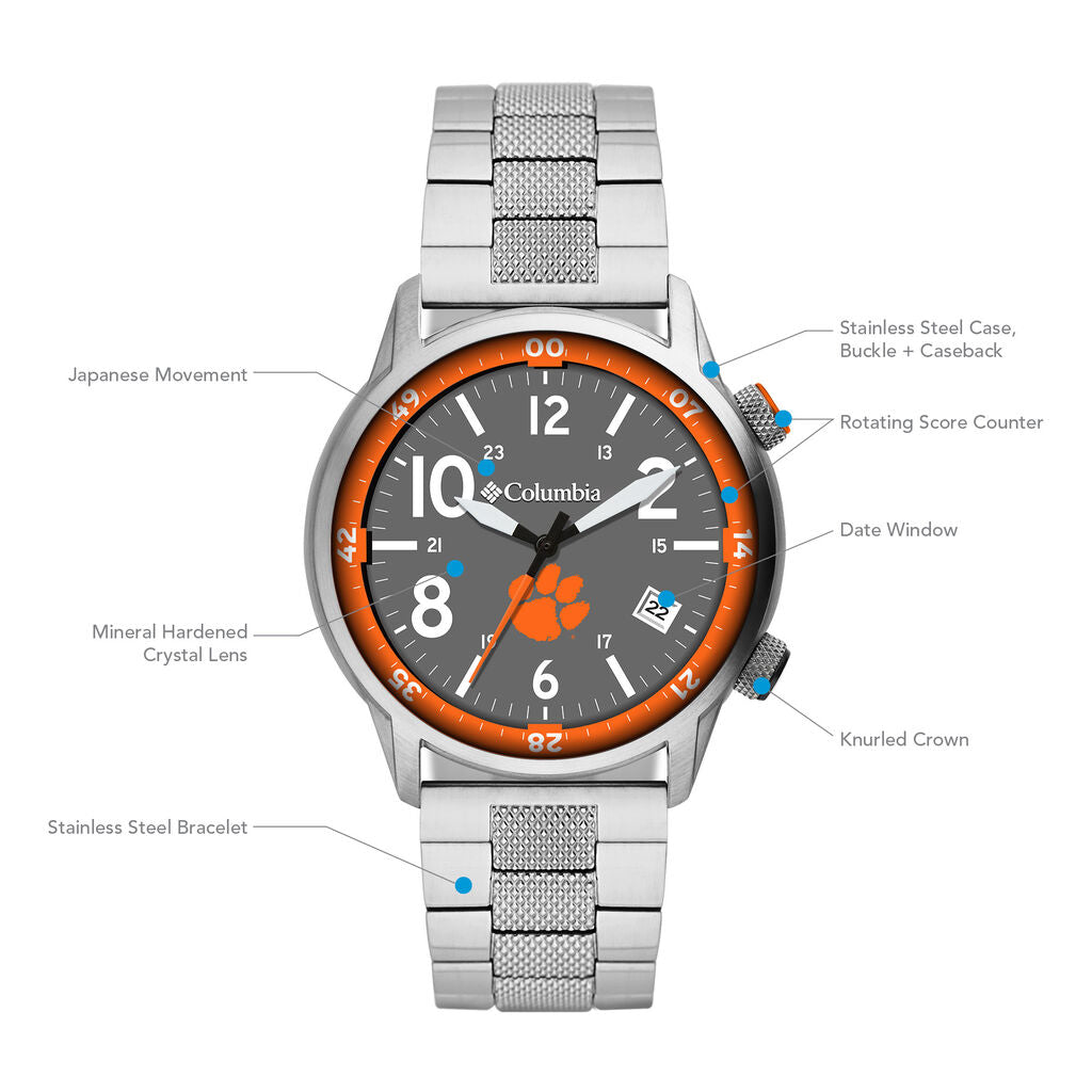 From the Columbia Collegiate collection, this Outbacker style Clemson University watch features a Grey dial with white hands and numeric markers, a date display at the four o'clock hour, an internal navigation compass and orange accents with mineral crystal in a 42.0mm stainless steel case. The reliable quartz movement keeps you right on time. The polished and textured stainless steel link bracelet secures with a push-button deployment clasp. Water-resistant to 50 meters
