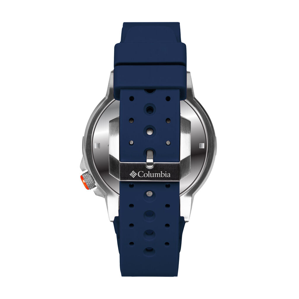 From the Columbia Collegiate collection, this Peak Patrol style Auburn University watch features a white dial with silver-toned hands and markers, a date display at the four o'clock hour and navy blue and orange accents with mineral crystal in a 42.0mm stainless steel case. The reliable quartz movement keeps you right on time. The navy blue silicone strap, with ribbed detailing, secures with a buckle clasp. Water-resistant to 50 meters.