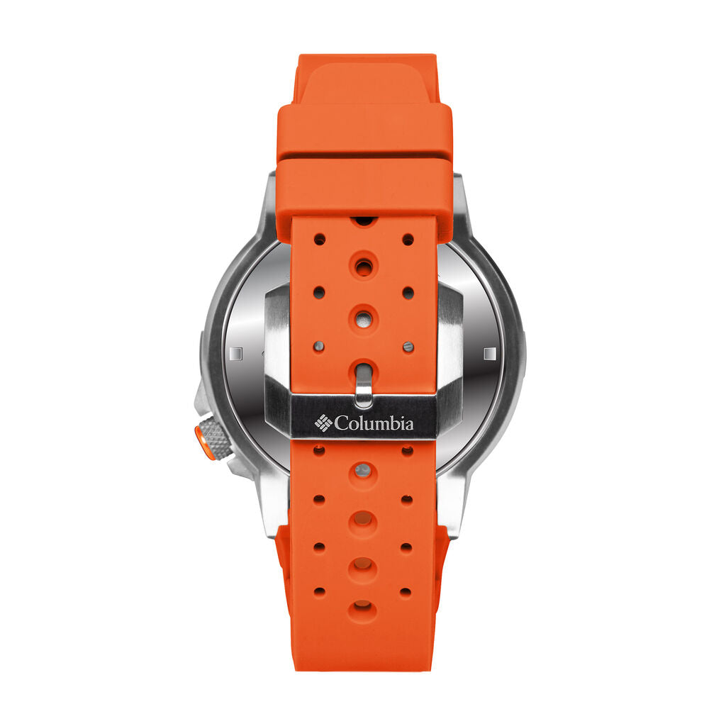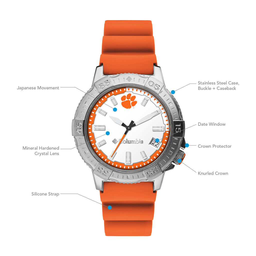 From the Columbia Collegiate collection, this Peak Patrol style Clemson University watch features a white dial with silver-toned hands and markers, a date display at the four o'clock hour and orange accents with mineral crystal in a 42.0mm stainless steel case. The reliable quartz movement keeps you right on time. The orange silicone strap, with ribbed detailing, secures with a buckle clasp. Water-resistant to 50 meters.