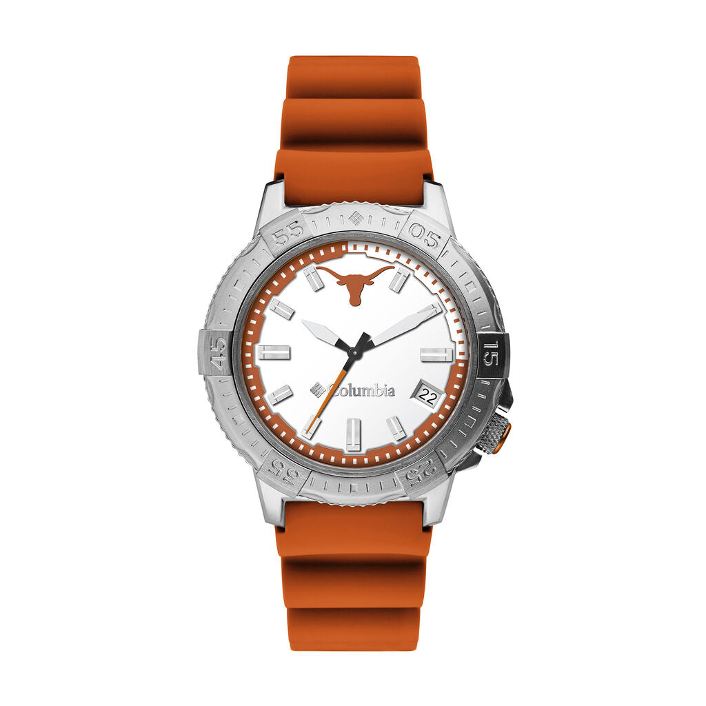 From the Columbia Collegiate collection, this Peak Patrol style University of Texas watch features a white dial with silver-toned hands and markers, a date display at the four o'clock hour and burnt orange accents with mineral crystal in a 42.0mm stainless steel case. The reliable quartz movement keeps you right on time. The burnt orange silicone strap, with ribbed detailing, secures with a buckle clasp. Water-resistant to 50 meters