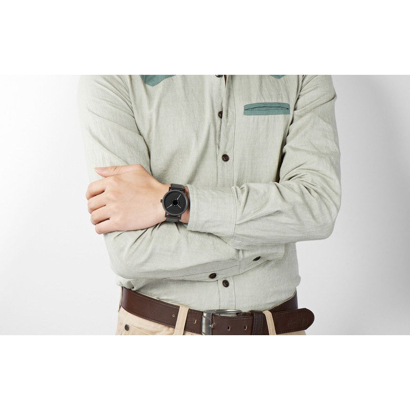 The Projects Watches Nadir Watch is named and inspired after the deepest point on a celestial sphere directly beneath a surface position. Designed by Australian designer Damian Barton, the Nadir watch never strays from the symbolic "core" of time itself.The varied thickness of arrows on the tips of hour, minute and second hands pinpoint the cycle of time on the dial centered underneath the lens. Like its inspiration, time is the Nadir.