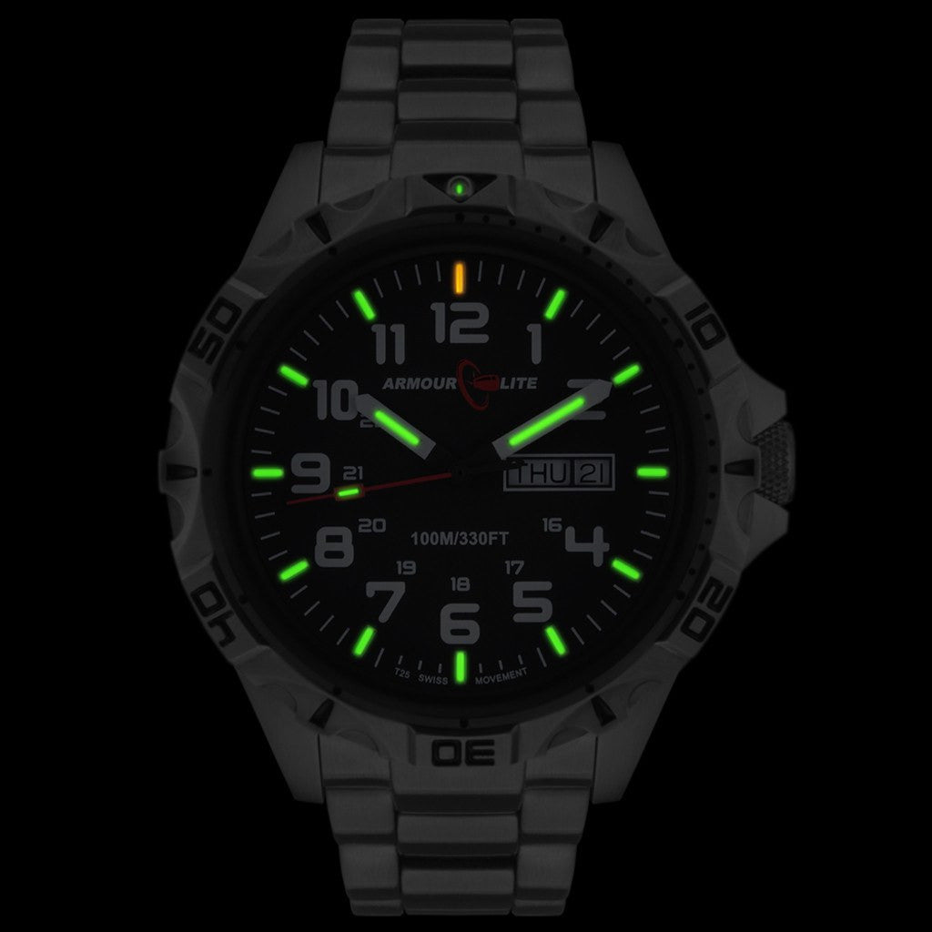 The Armourlite AL1401 Professional Watch is a durable timepieces with a shatterproof crystal resting on a stainless steel case and steel band for durability and style. This professional watch is durable and versatile with date function and tritium illumination for clear visibility in the lowest of light conditions.