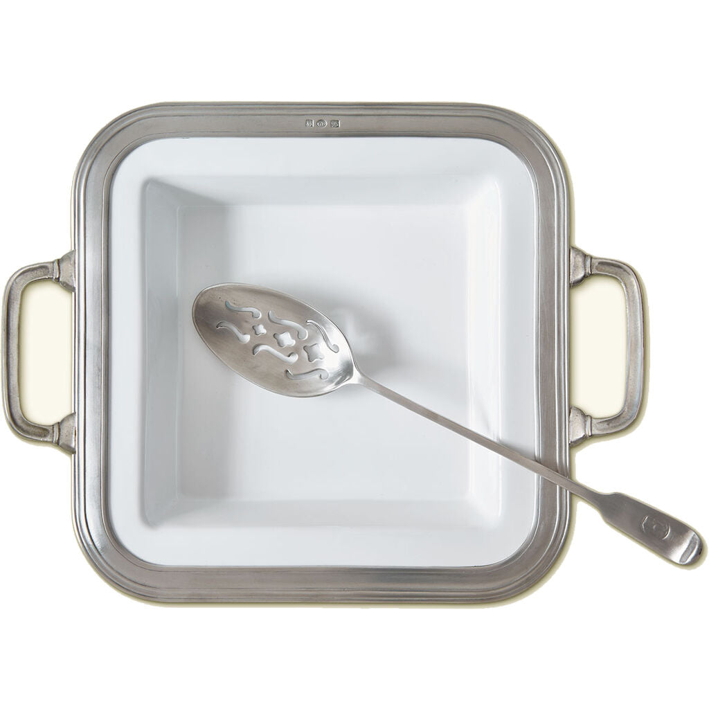 With a flawless white ceramic body and warmly glowing pewter rim, the Gianna square serving dish adds a rustic charm to an ordinary table setting.