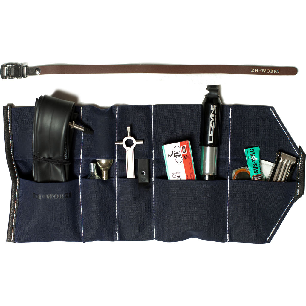 The EH Works Essential Bike Tool Roll in Navy with a Brown Strap carries everything you need for any ride, whether across town or across borders. The Tool Roll is made of waxed canvas, leather trim and a leather toe strap to cinch the roll under your seat or drop into a bottle cage. It has 10 small pockets of varying size that offer you just the right spot for all of your gear.