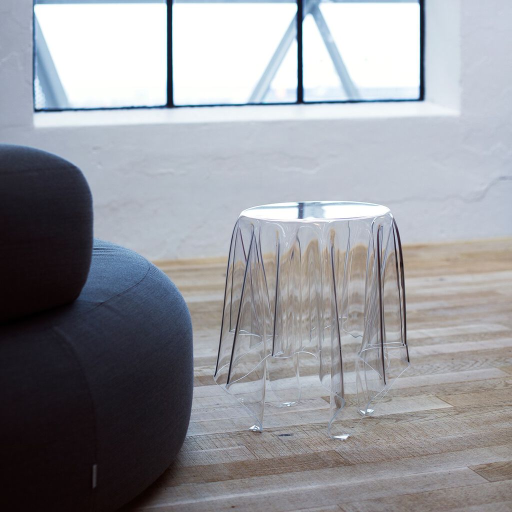 A timeless statement of beauty, simplicity, and functionality. The Illusion Side Table from Essey comes in a crystal transparent look. Inspired from a cafe in Copenhagen with long table cloths touching the floor. Designer John Brauer wanted to recreate the illusion of the table cloth without the table. After many no's from multiple workshops, Essey made the perfect Illusion table through a lot of trial and error. Each table is hand made for a unique one-of-a-kind look.