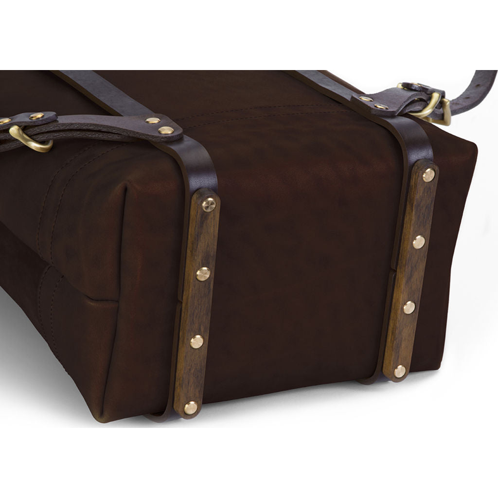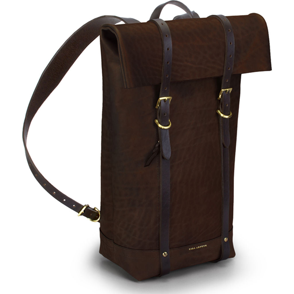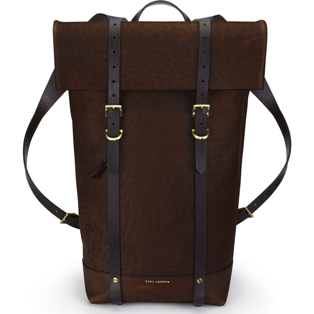 For a weekend getaway or daily work routine, Ezra Arthur's Keystone Rucksack backpack in Malbec & Brass is refined and crafted to perfection with heirloom quality to last a lifetime. A roll-top backpack design with Horween's Chromexcel full grain leather and Brass hardware that will last and never run out of style. Versatile and convenient, the Keystone features a large interior pocket with ample space for a 15-inch laptop and a smaller inside pocket to keep possessions within reach. A hidden front zipper and quick-release snaps on the top allow for easy entry without unbuckling the hardware. The roll-top nature of the backpack allows you to expand its capacity to suit your needs, making it the ideal carry good in any situation. Additional reinforcement with thick harness leather straps and ironwood skates to protect the bottom of the bag & allow it to stand upright. The leather is formulated to be durable, smooth, supple, and provide scratch-resistant properties. Bring the Keystone Rucksack to every adventure and watch it age beautifully over time for many generations.