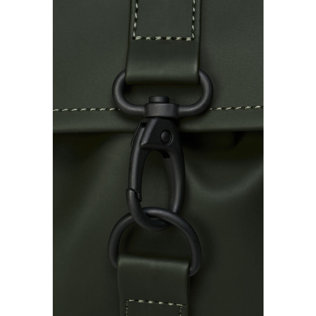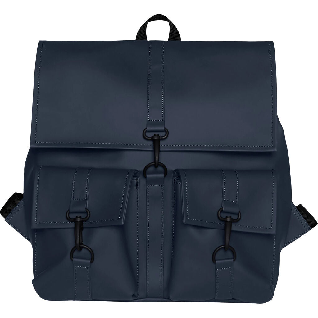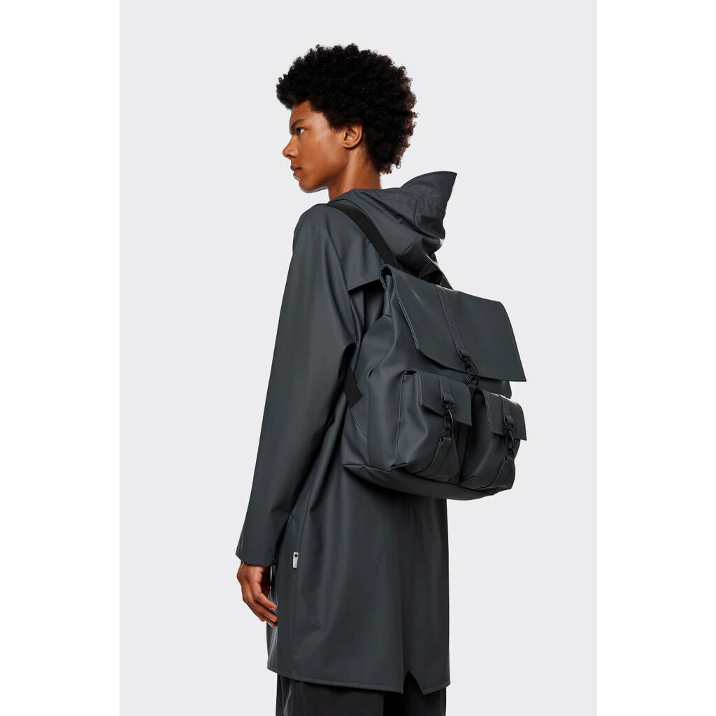 MSN Cargo is a modified version of RAINS signature backpack, MSN Bag. This medium version of the classic features two front cargo pockets with RAINS’ maritime carabiner closures. Inspired by the traditional school backpack, the MSN silhouette is created from waterproof fabric and fully lined on the inside. MSN Cargo has a main compartment sealed with side snap-buttons and a top flap secured by carabiner closures. MSN Cargo is finished with adjustable webbing shoulder straps.