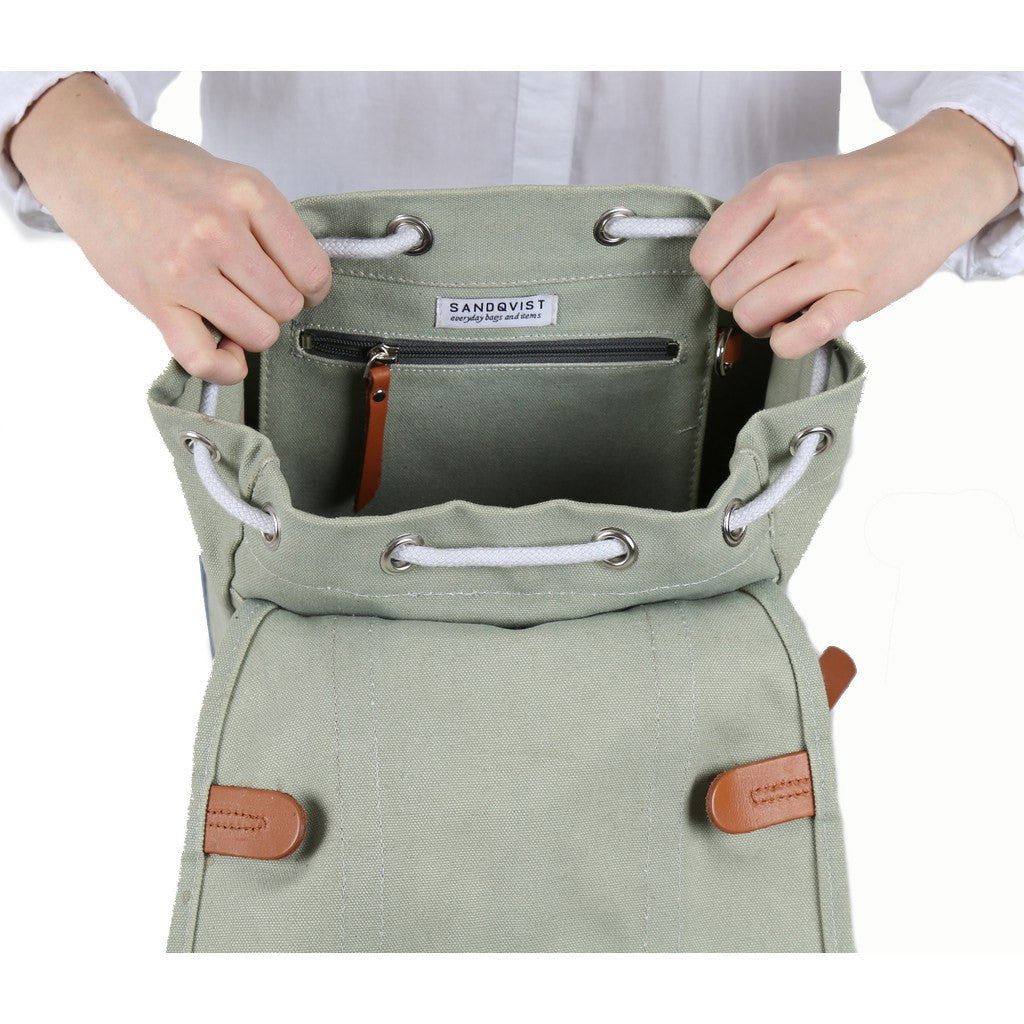 Sandqvist's Sage Green Stig Backpack is crafted with cotton canvas and leather details for a clean, simple look. This heavy duty pack features an inner zipper pocket, a laptop sleeve, and adjustable shoulder straps for comfort. Wear this pack on your way to school, work, or on your day off.