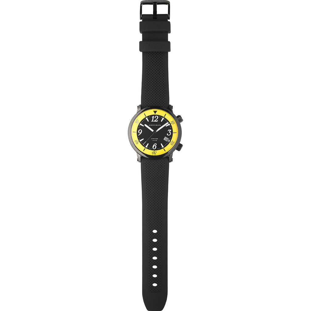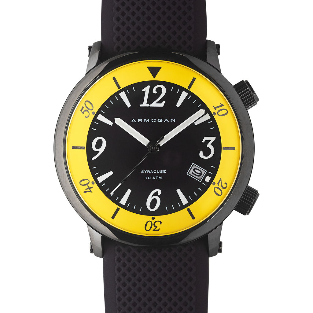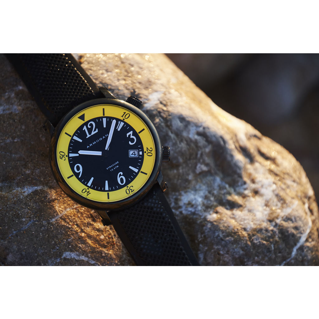 Dive into the unknown with Armogan's Syracuse N24 Diving Watch in Yellow and Black Steel. Armogan celebrates the Sicilian coastal town that gave birth to free diving in the 1960's. The vintage boat gauges inspired look is compact to give you full range of your wrist. This diving watch is equipped with a miyota 2315 movement, domed sapphire crystal, a window display for the date, and a 42mm wide stainless steel case to handle all waves that come your way. Designed for water living, the Syracuse is suitable for recreational water sports to daily use at work.