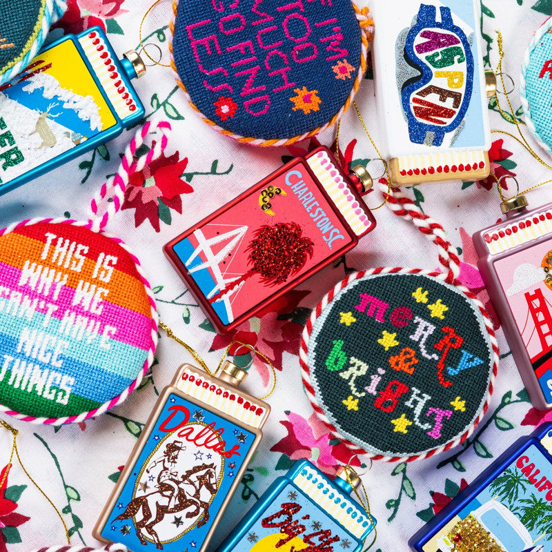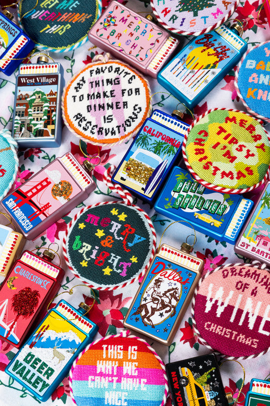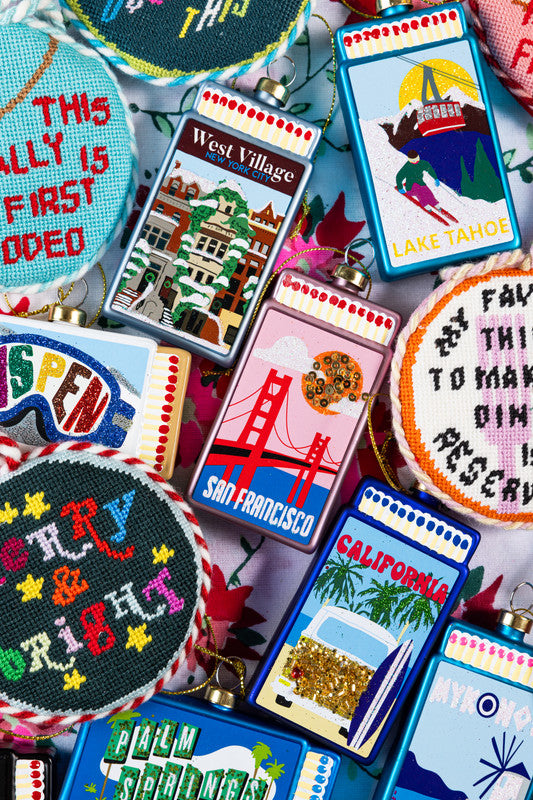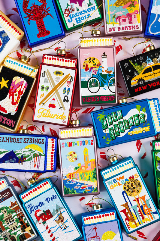 The Furbish Matchbook Ornament is a vibrant and playful glass ornament designed to bring a touch of wanderlust to your holiday decor. Shaped like a matchbook, it features a colorful design with different names spelled out in glittery letters across a pair of ski goggles, capturing the essence of this iconic destination. With its sparkling details and whimsical charm, this ornament is perfect for adding a festive and rad twist to your Christmas tree.