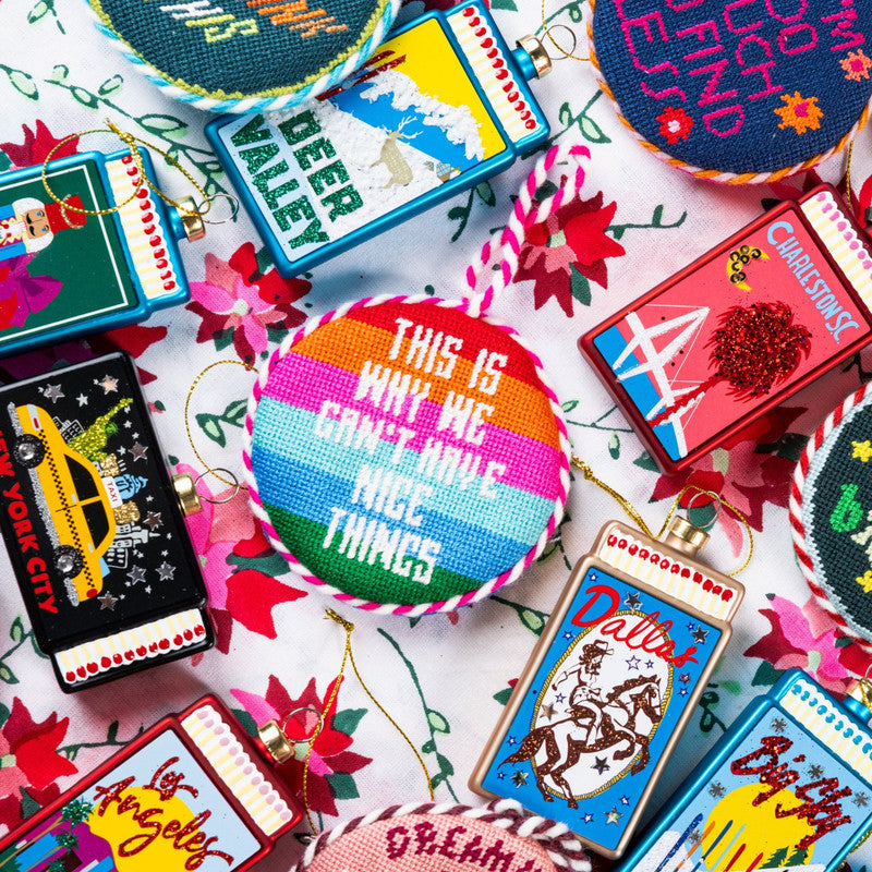 The Furbish Needlepoint Ornament is a delightful keepsake that adds a touch of charm and chic to your holiday decor, perfect for celebrating your baby's first Christmas. Backed in luxurious velvet, this ornament revives the Southern tradition with a modern twist, featuring playful sayings designed to bring a smile. Elevate your festive decorations from traditional to trendy with Furbish's curated collection, including needlepoint pillows, ornaments, tree toppers, stockings, and tree skirts, ensuring your holiday season is both stylish and memorable.