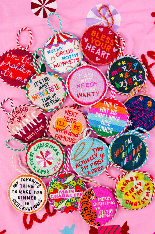 - Intricately crafted needlepoint ornament with delightful, playful sayings.