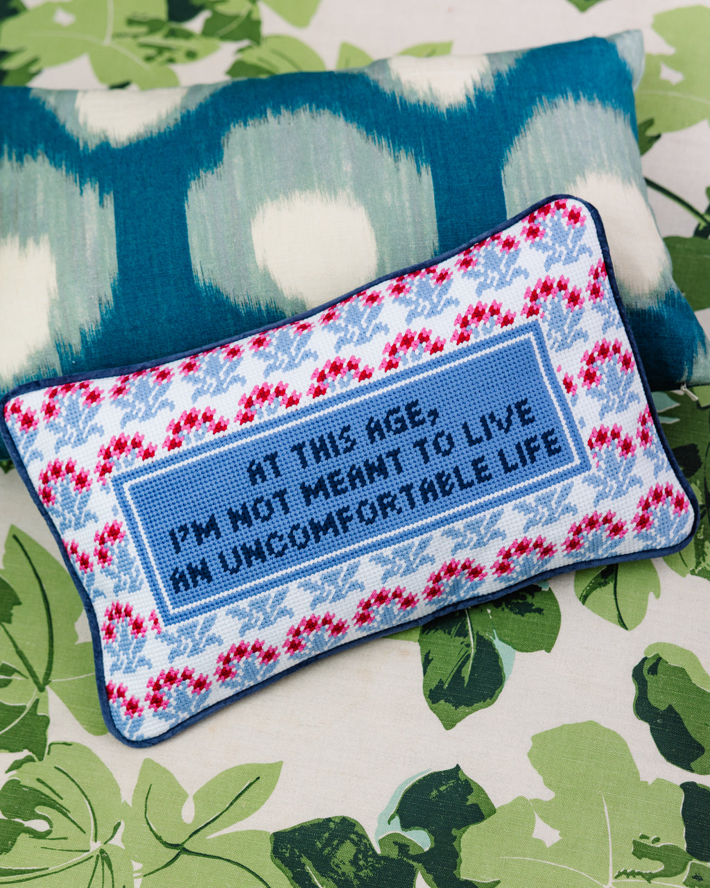 Bring the charm, wit, and just the right amount of edge with this cheeky needlepoint pillow from Furbish. Hand-stitched with 100% wool yarn and finished with a luxe cotton velvet back, it’s a fabulously crafted piece that’s equal parts irreverent and refined. Whether tossed on your bed, sofa, or favorite chair, it delivers major personality in one punchy package. Designed to stand out in maximalist, eclectic, or boho spaces, this statement pillow is here to stir things up—in the chicest way. Spot clean only to keep the sass intact.
