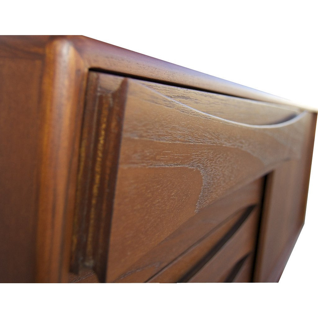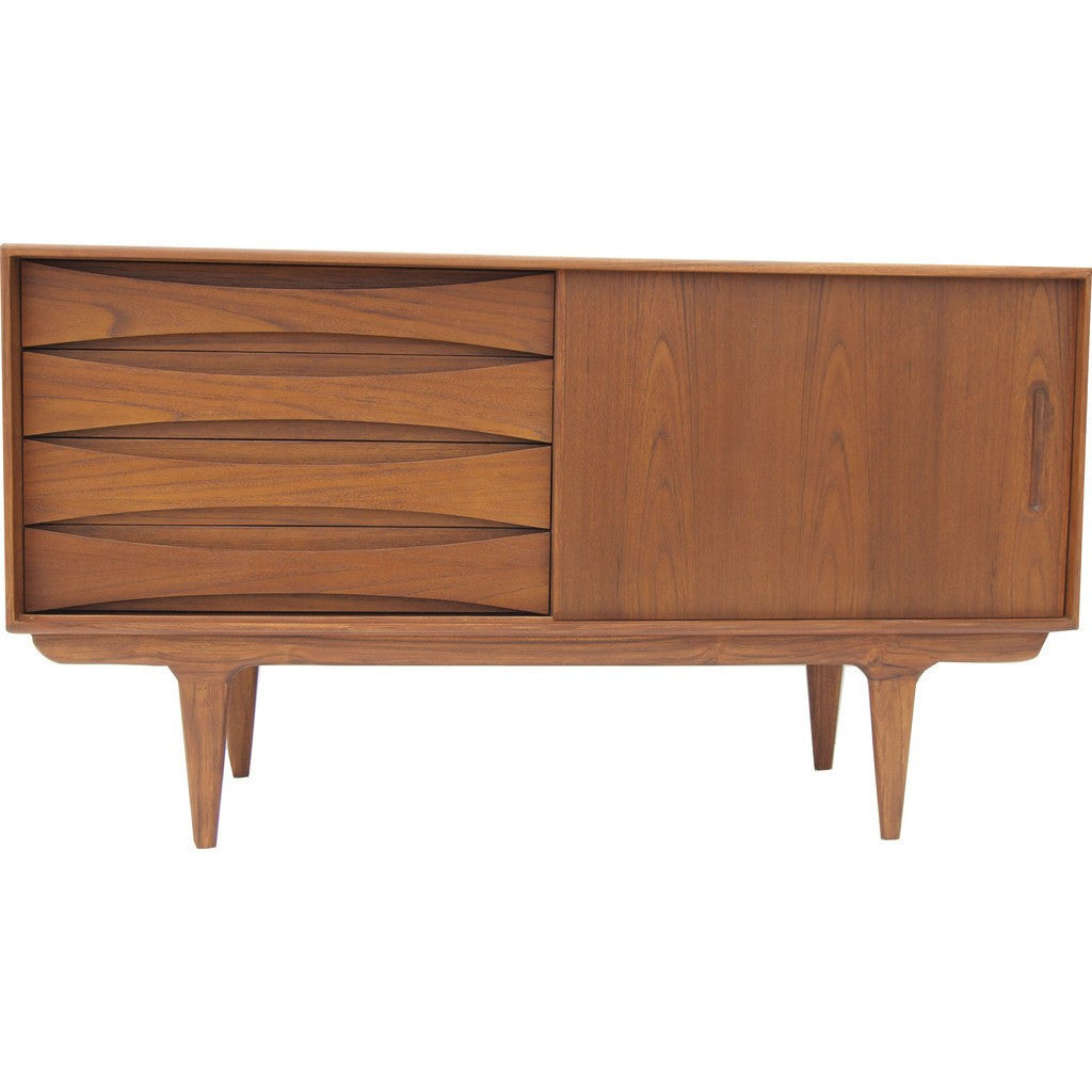Inspired by mid century furniture styles, Bowery and Grand makes each piece with quality materials. The Stockton Media Console is made with solid teak and a veneer teak wooden core frame. The Stockton features four drawers, two adjustable shelves and a sliding door.
