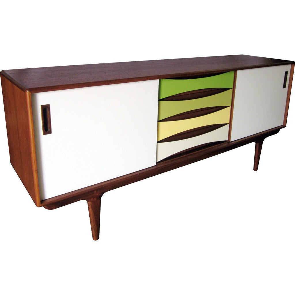 Inspired by mid century furniture styles, Bowery and Grand makes each piece with quality materials. The Sprout Sideboard is constructed with solid teak, a veneer teak wooden core frame, and high resiliency multi-colored laminate. The Sprout features four drawers, adjustable shelves and two sliding doors.