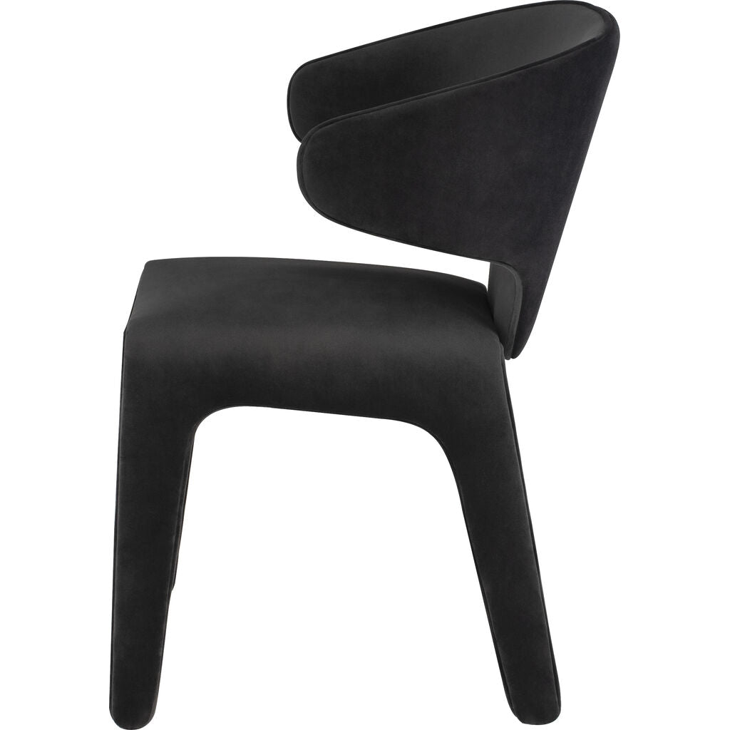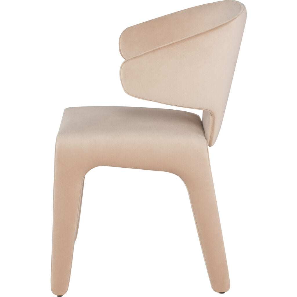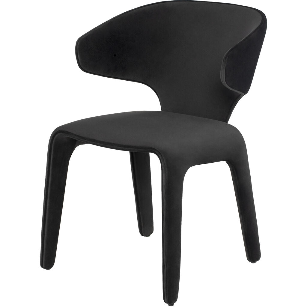 The fluid lines of the Bandi dining chair create a soft and organic addition to any dining room. In rich velour, the gently curved back makes a graceful statement from behind. Its beautifully constructed with sturdy, upholstered legs and a shapely design.