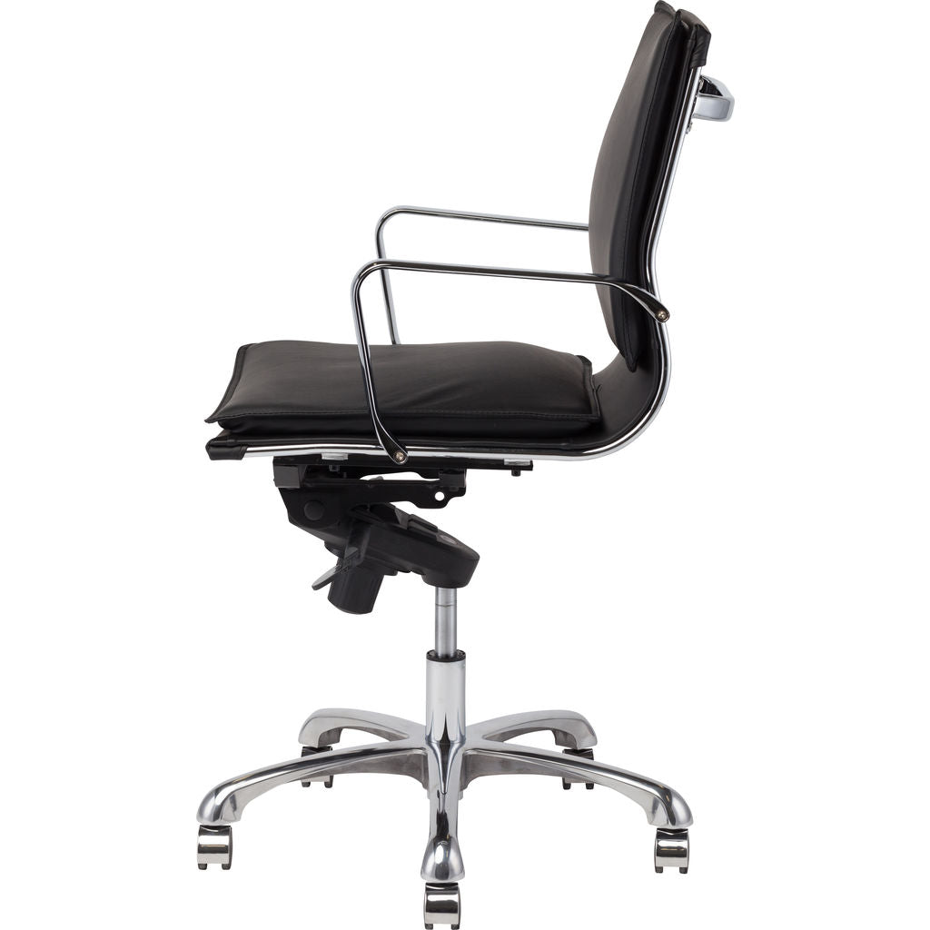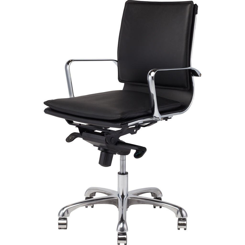 Blending contemporary design and premium construction, the Carlo Swivel Chair features a chromed iron frame, chromed aluminum base and matching cap castors. The gas lift has a 2.75" travel; making adjustments seamless, simple and quick. Each Carlo Desk Chair is upholstered in supple black Naugahyde for an attractive look and comfortable feel.