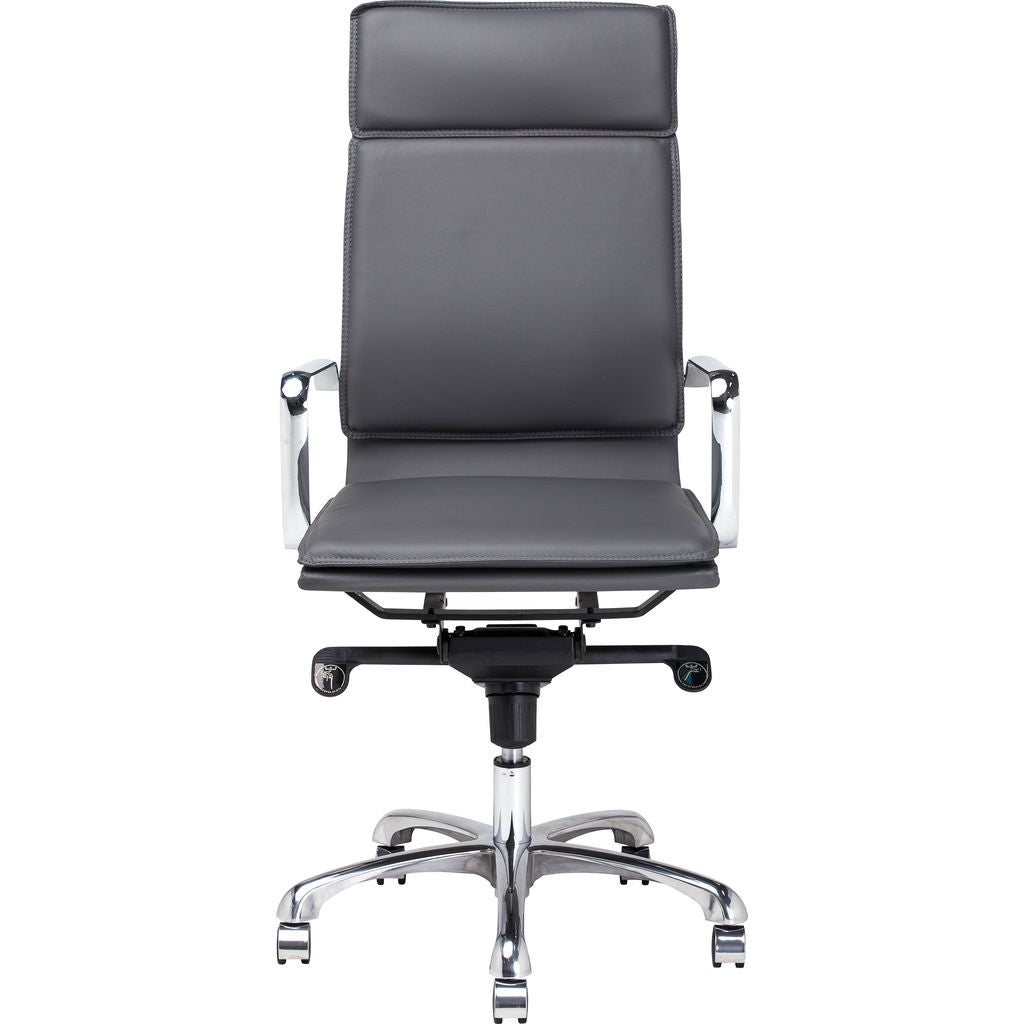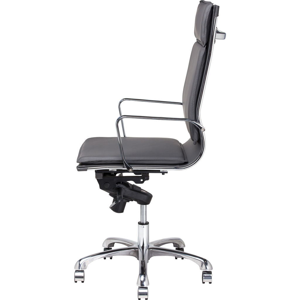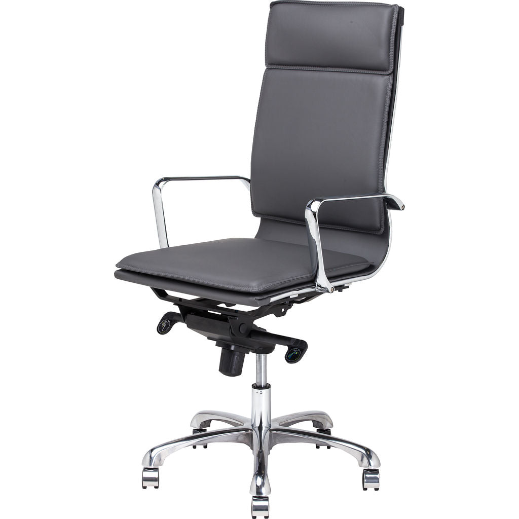 Blending contemporary design and premium construction, the Carlo Swivel Chair features a chromed iron frame, chromed aluminum base and matching cap castors. The gas lift has a 2.75" travel; making adjustments seamless, simple and quick. Each Carlo High Back Desk Chair is upholstered in supple gray Naugahyde for an attractive look and comfortable feel.