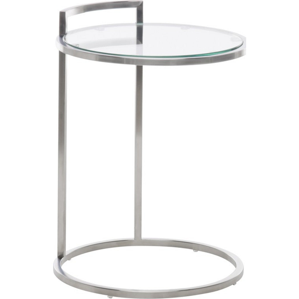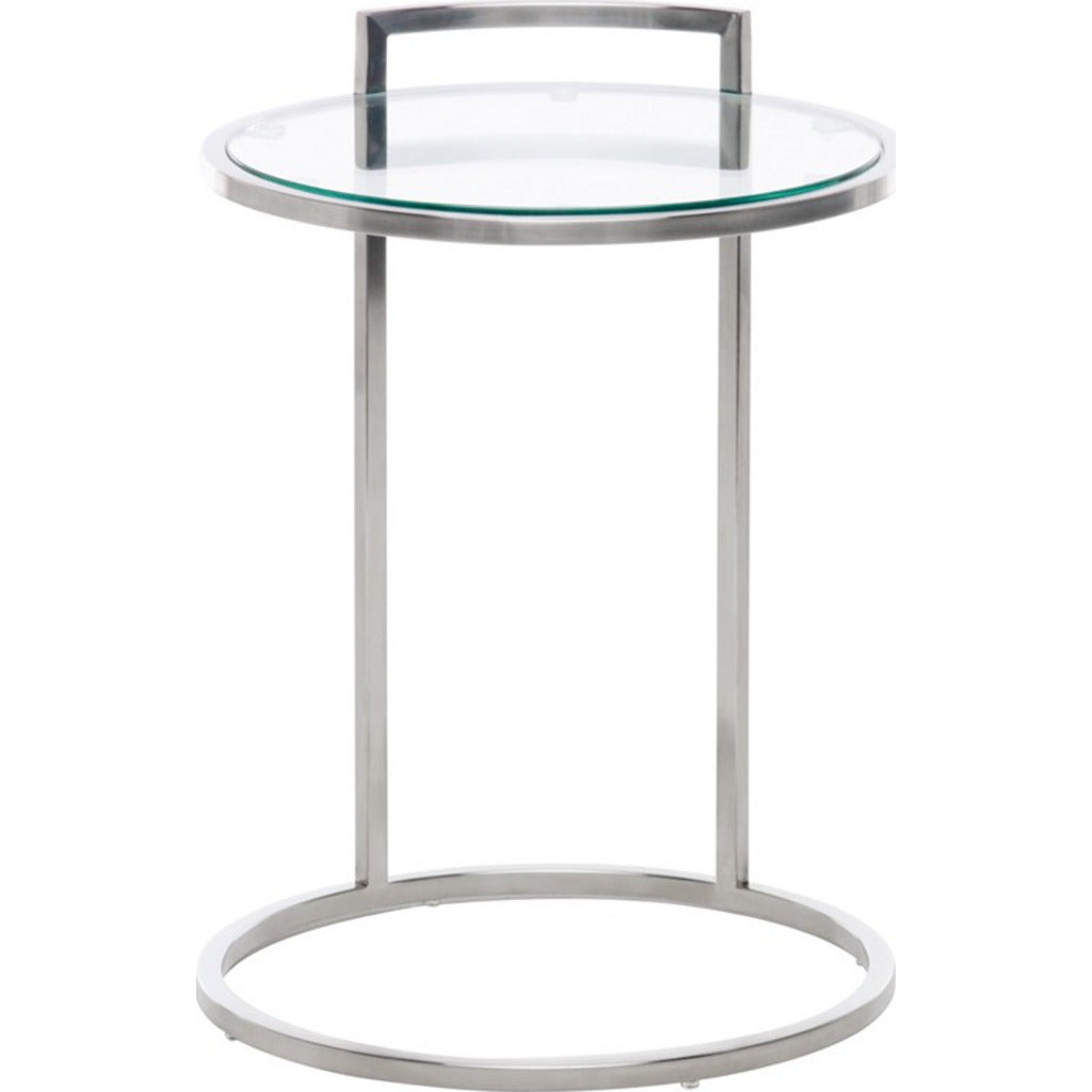 The Lily side table features an elegant rendering of mirrored forms in delicate steel and glass. A simple rounded table top supported by two exceptionally slim legs is matched by an open circular base presenting a light, weightless aesthetic. Simple, elegant, smart.
