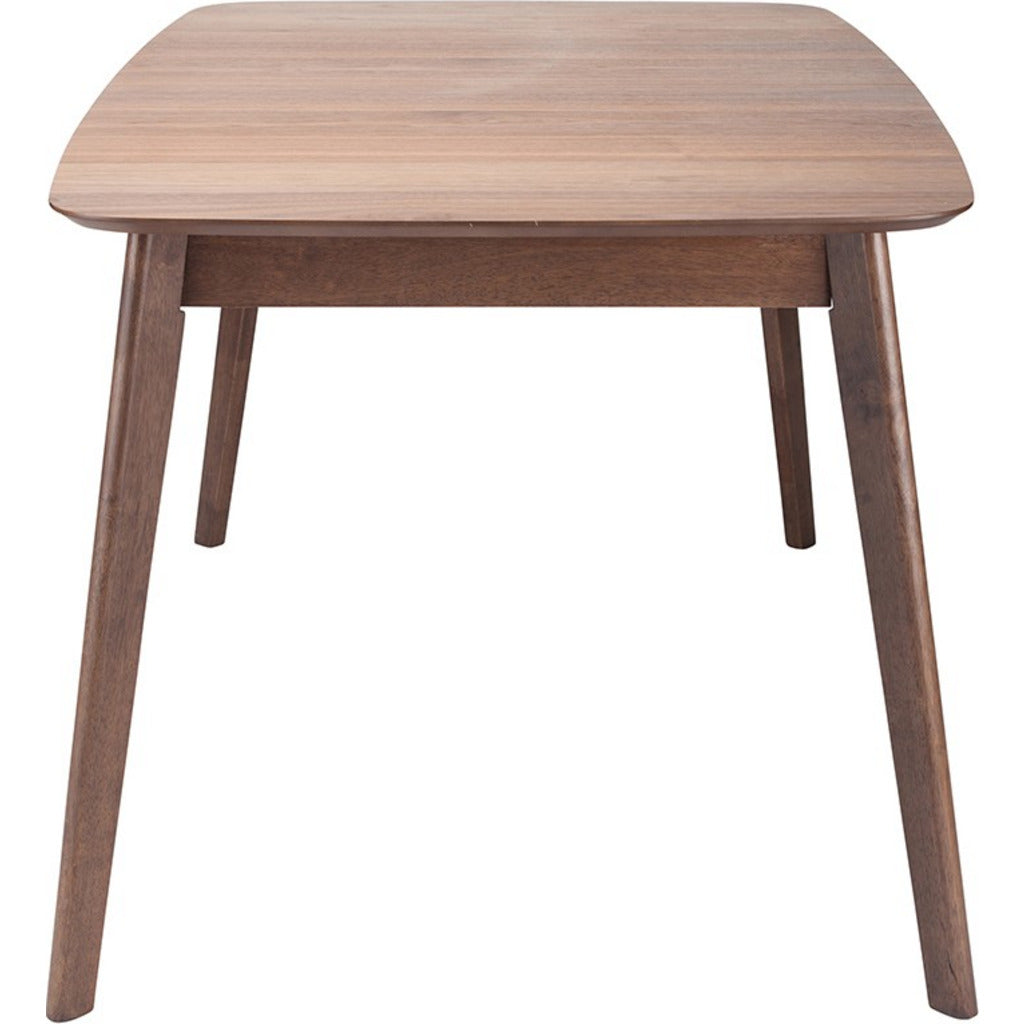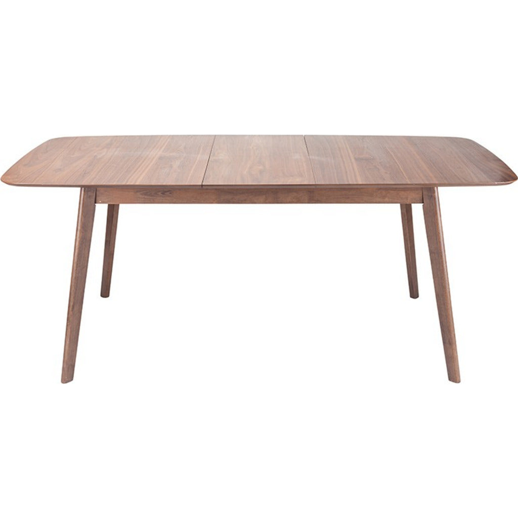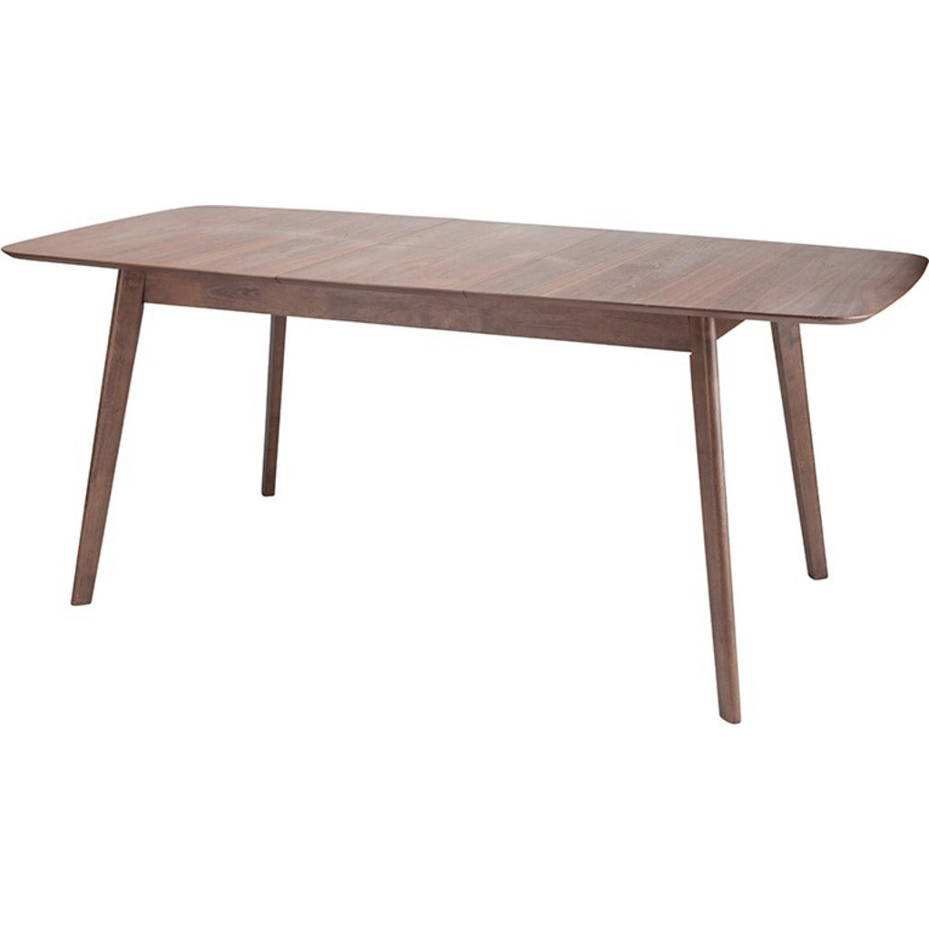 The elegantly understated mid-century inspired Loel dining table features American Walnut veneer, Walnut-stained Rubberwood legs, and a 15.8 inch extension leaf.