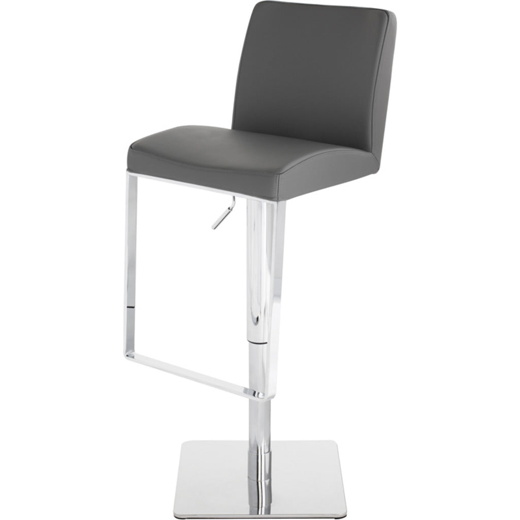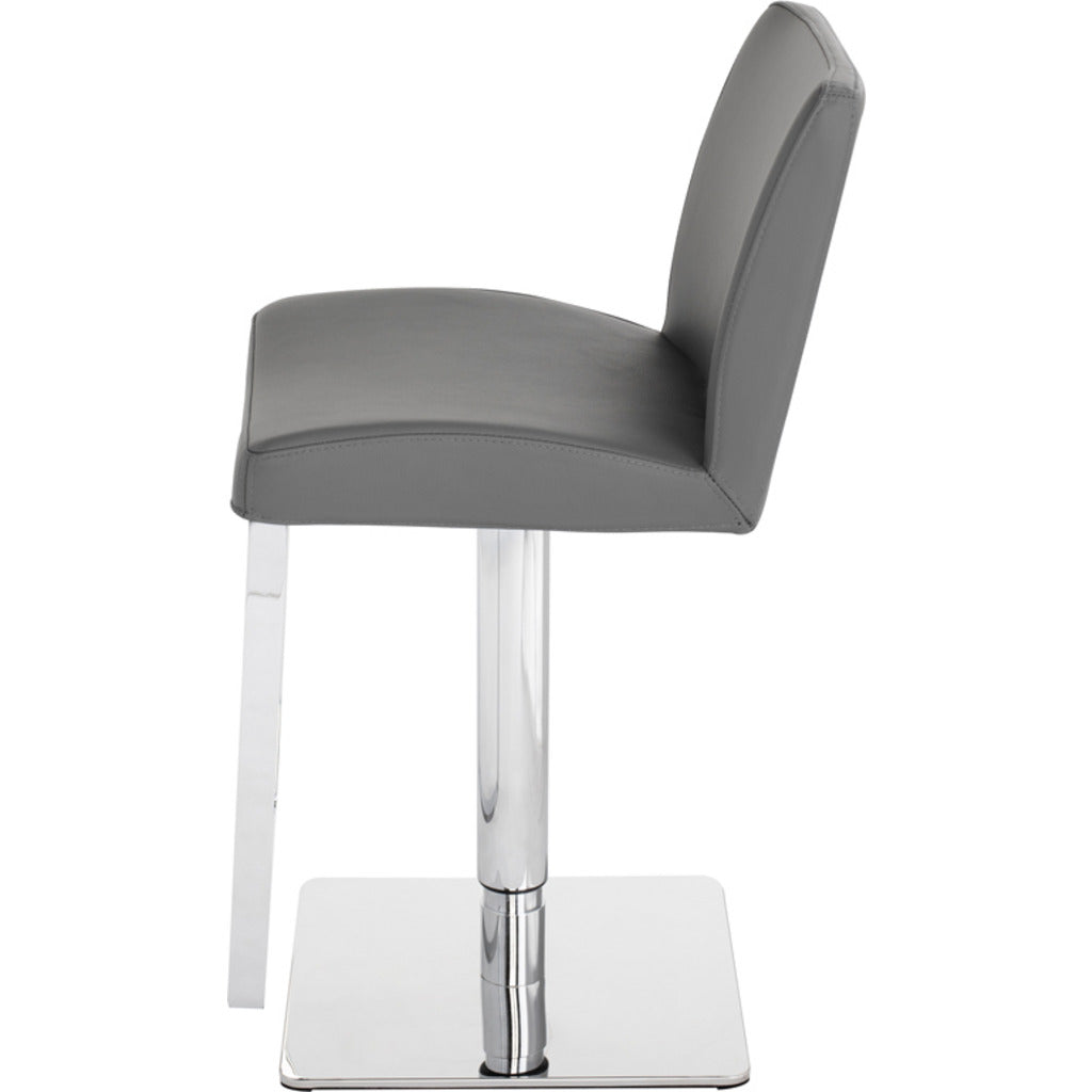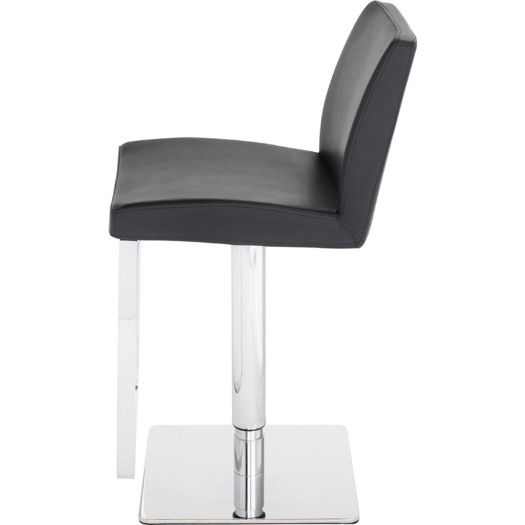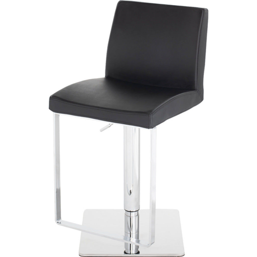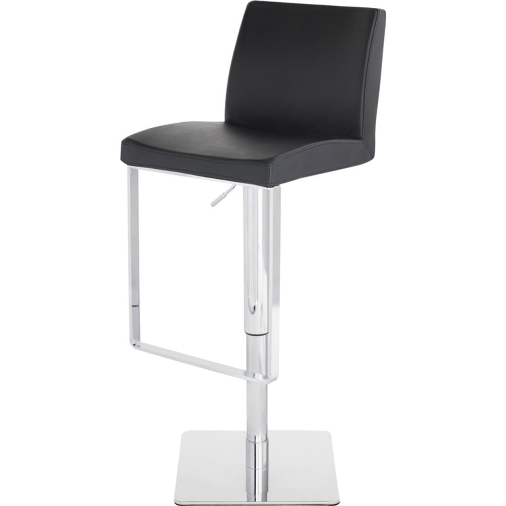 The Matteo adjustable stool combines crisp modern design with comfortable, easy, functionality. The bar seat is made with leather, accented by a wrap-around high polish stainless steel foot rest. The hydraulic stainless steel base adjusts height up and down with the simple squeeze of a discreet hand lever placed within easy reach under the bar seat. Adjustable between 32 inches and 42 inches.