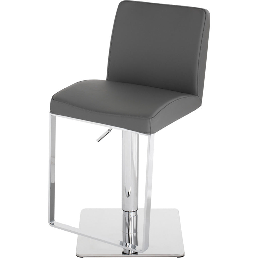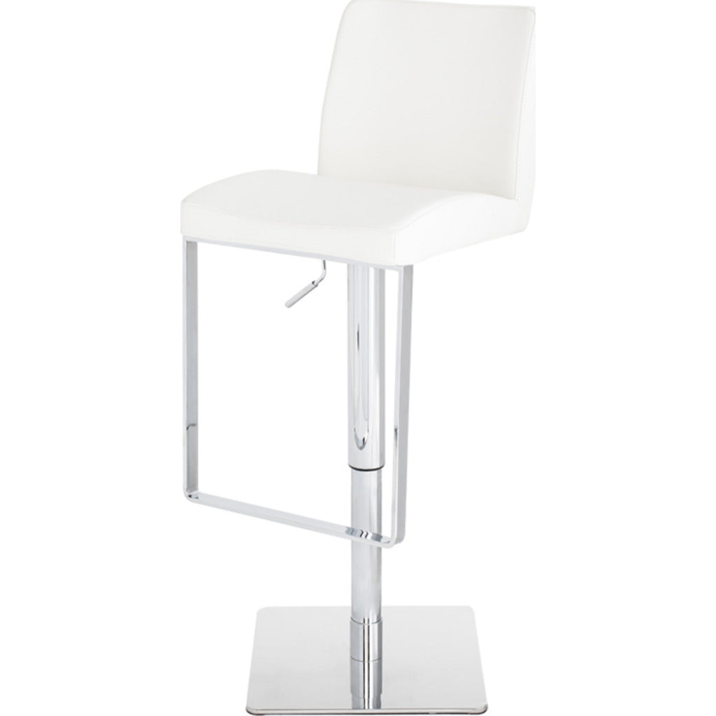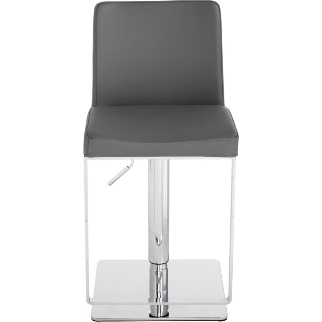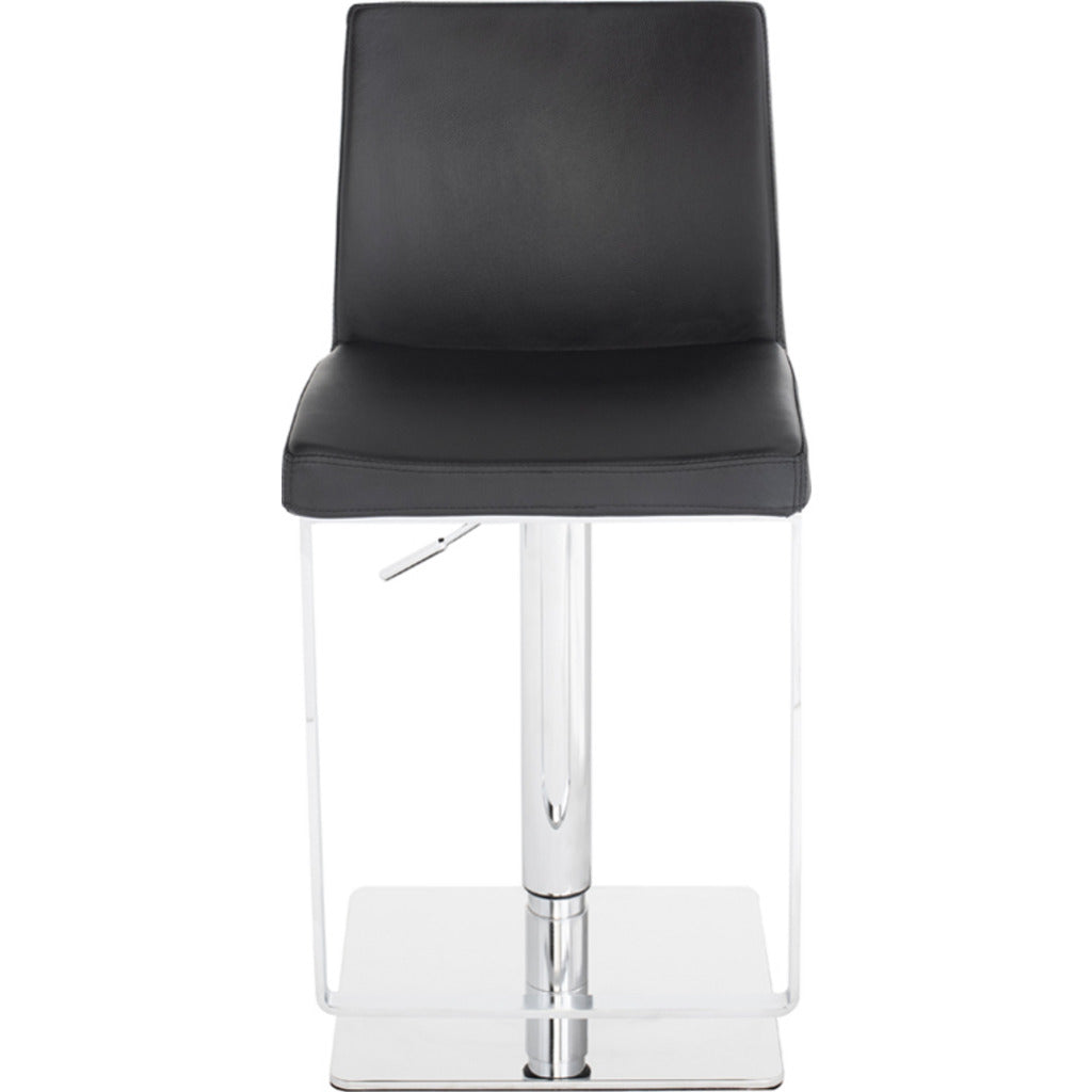 The Matteo adjustable stool combines crisp modern design with comfortable, easy, functionality. The bar seat is made with leather, accented by a wrap-around high polish stainless steel foot rest. The hydraulic stainless steel base adjusts height up and down with the simple squeeze of a discreet hand lever placed within easy reach under the bar seat. Adjustable between 32 inches and 42 inches.