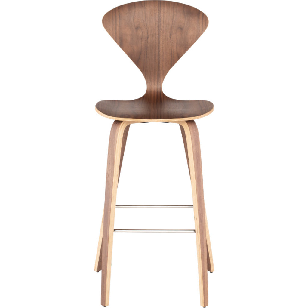 The Satine bar stool is an inspired collaboration of design and craftsmanship. An eye catching design of formed and sculpted plywood with an American walnut veneer. Adding dimension and strength, a stainless steel rod footrest is an elegant feature in high polish stainless steel.