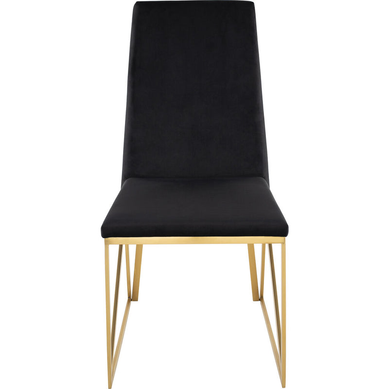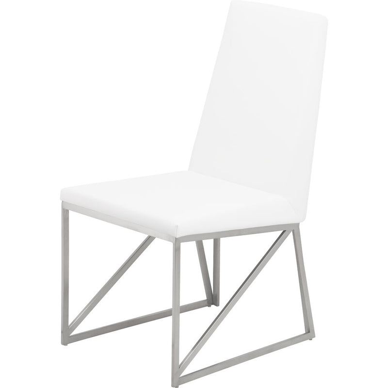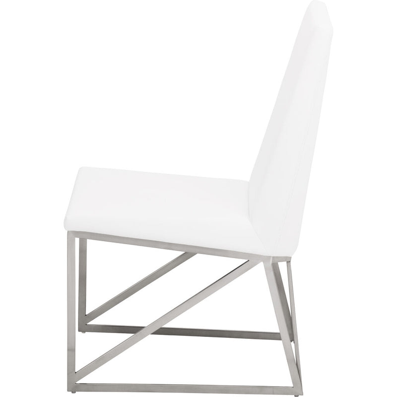 The Caprice dining chair features crisp modern lines and easy comfort. The light elegant brushed stainless steel frame incorporates a unique linear triangle design providing added structural support. A well-padded seamless white naughyde seat and seat back is tailored.