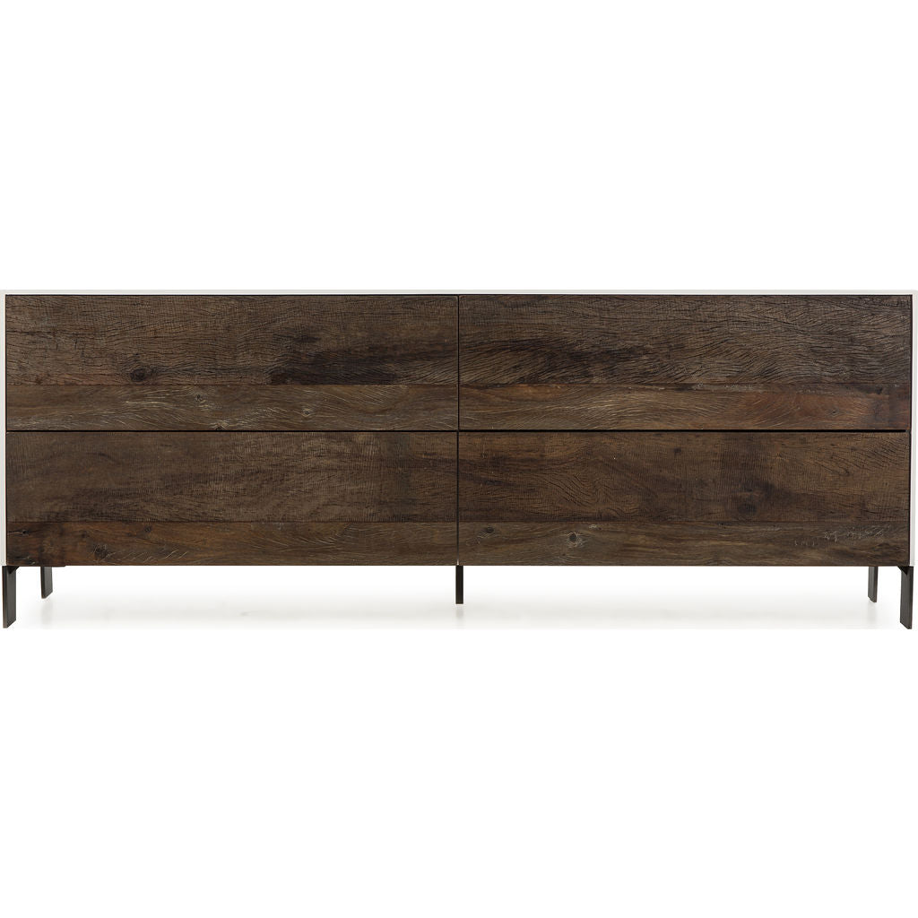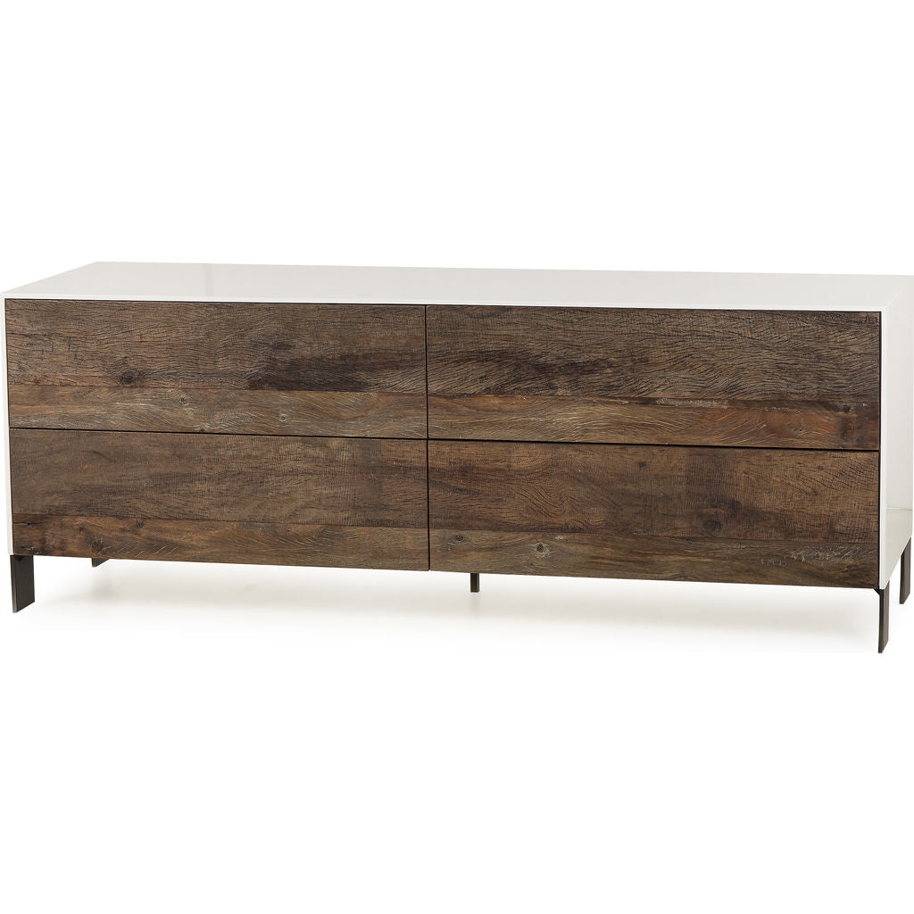 Subtle elegance with practical purpose - designer Thomas Bina captures a minimalist aesthetic with contemporary influence in this storage piece. The Cardosa Six Drawer Dresser features the natural luster of peroba wood on the solids that compose the drawers, and a clean white lacquered shell. Complete with black steel feet and plastic floor protectors.