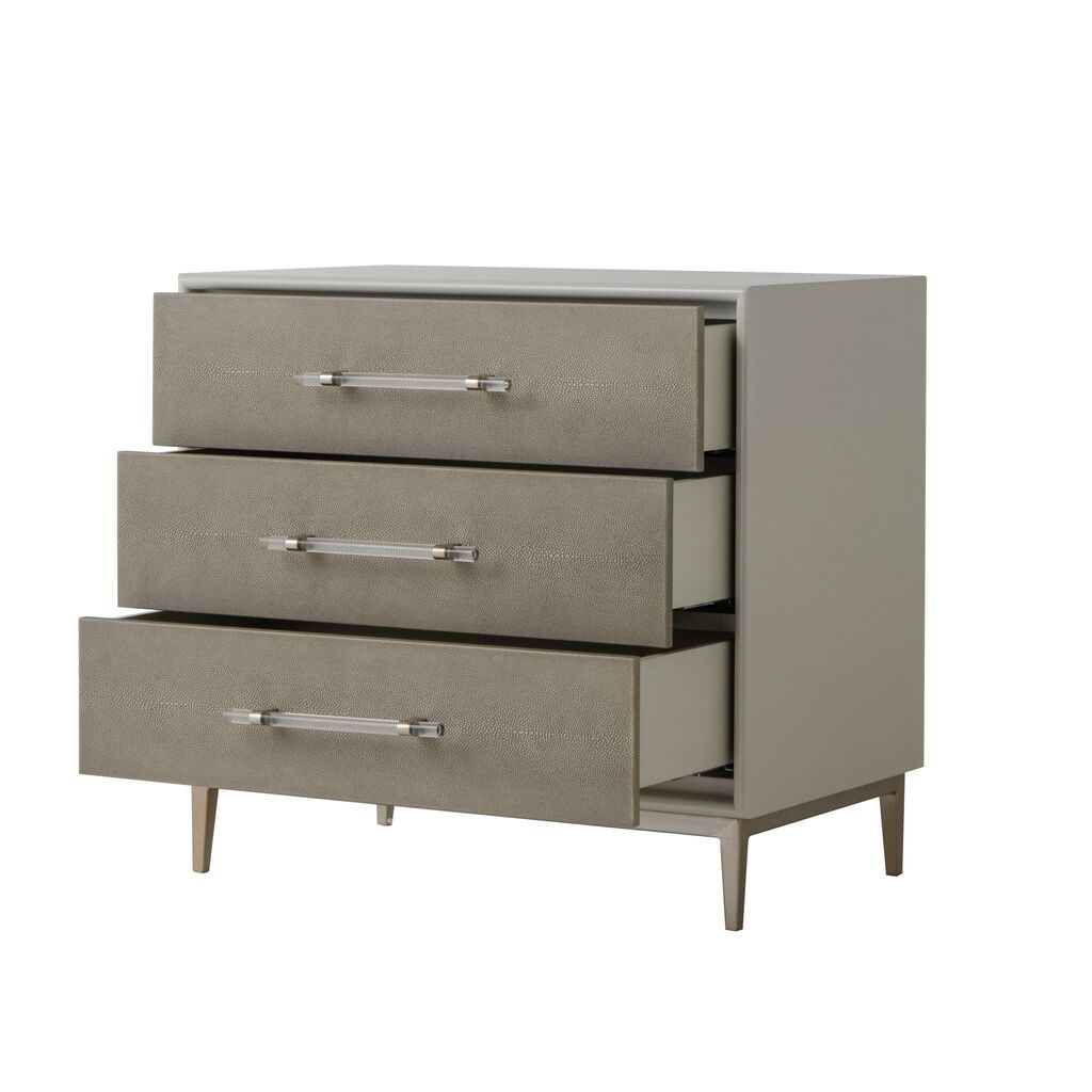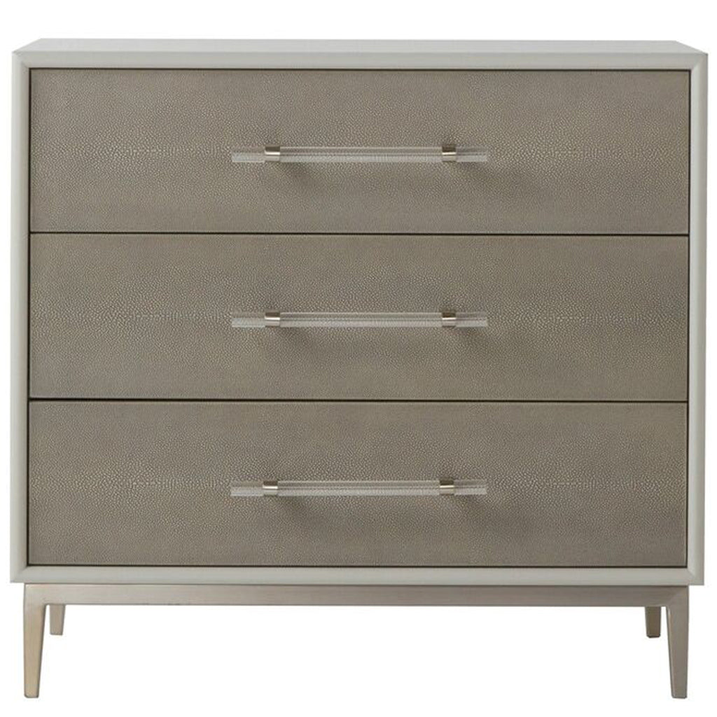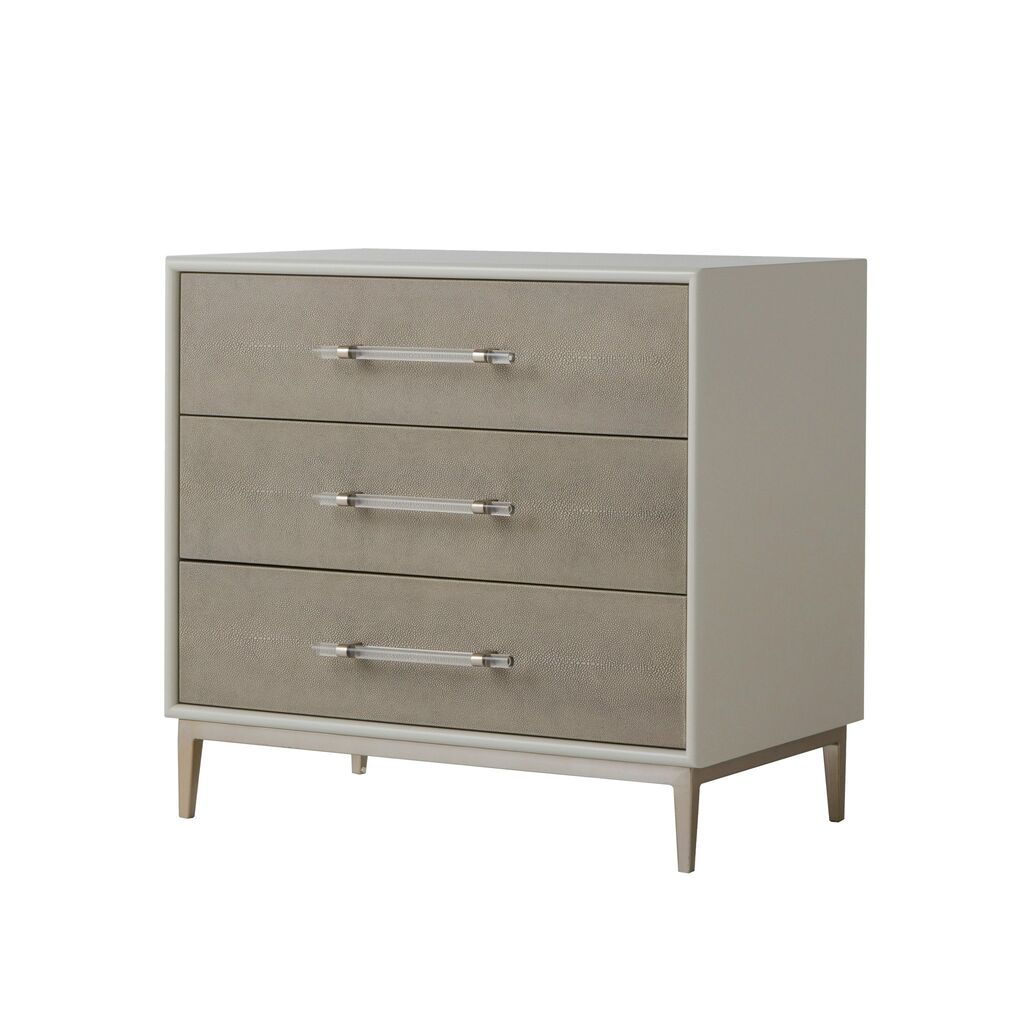Stylishly formed; this three-drawer nightstand is a versatile piece for both contemporary and traditional interiors. The elegant metal frame contrasts perfectly with luxurious faux shagreen drawer fronts. Solid perspex handles complete its look giving it an extra chic touch. Pairs particularly well next to the Alice Bed. Due to the nature of shagreen, the coloring may vary from one piece to another, these differences add to the natural beauty of the product. The color may also vary with time.