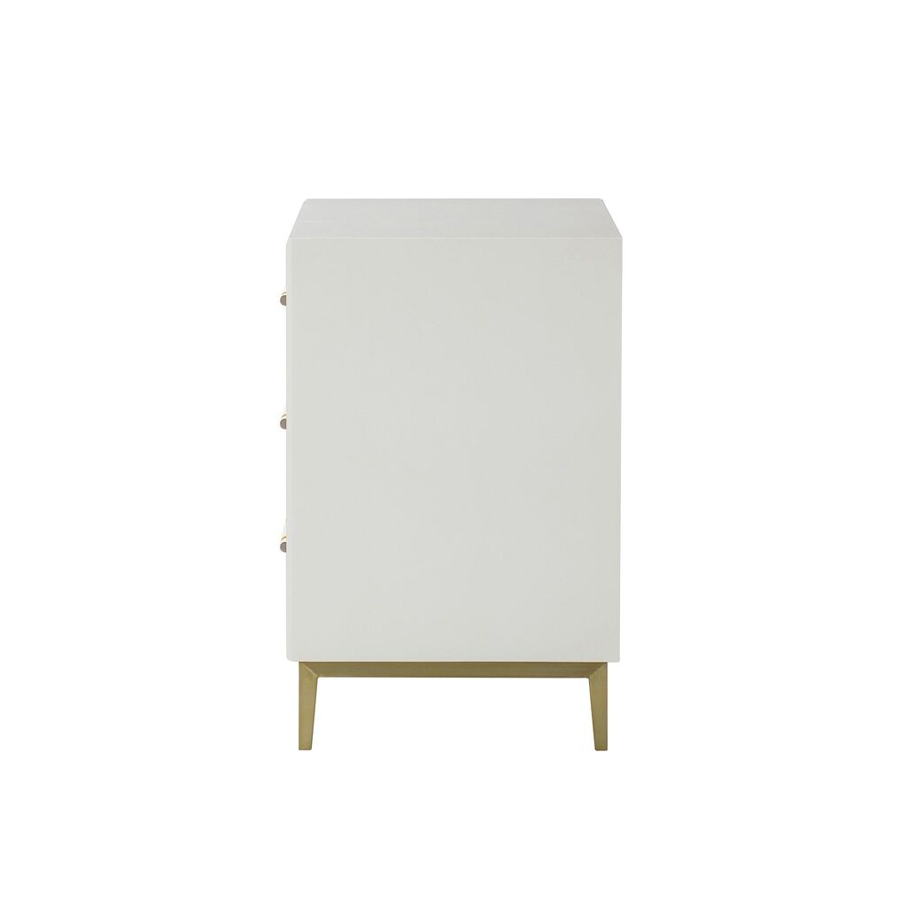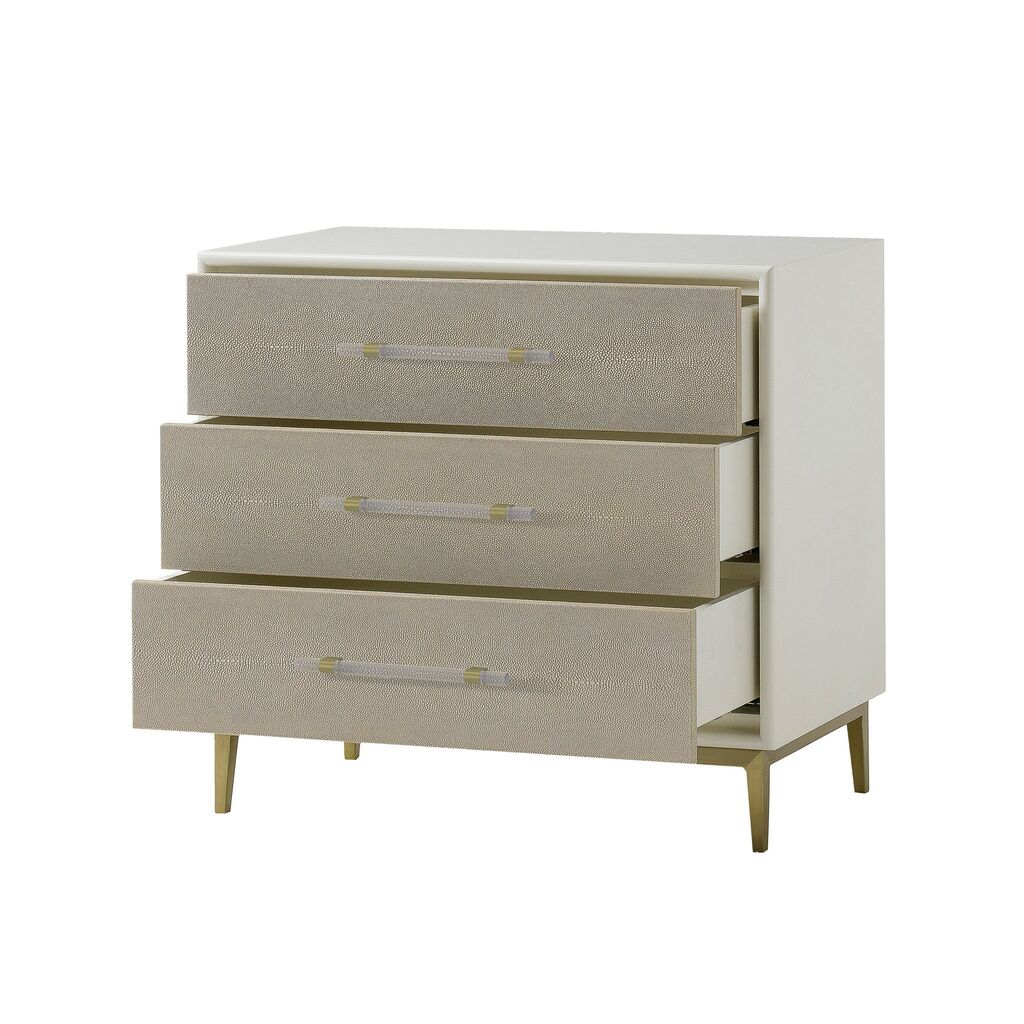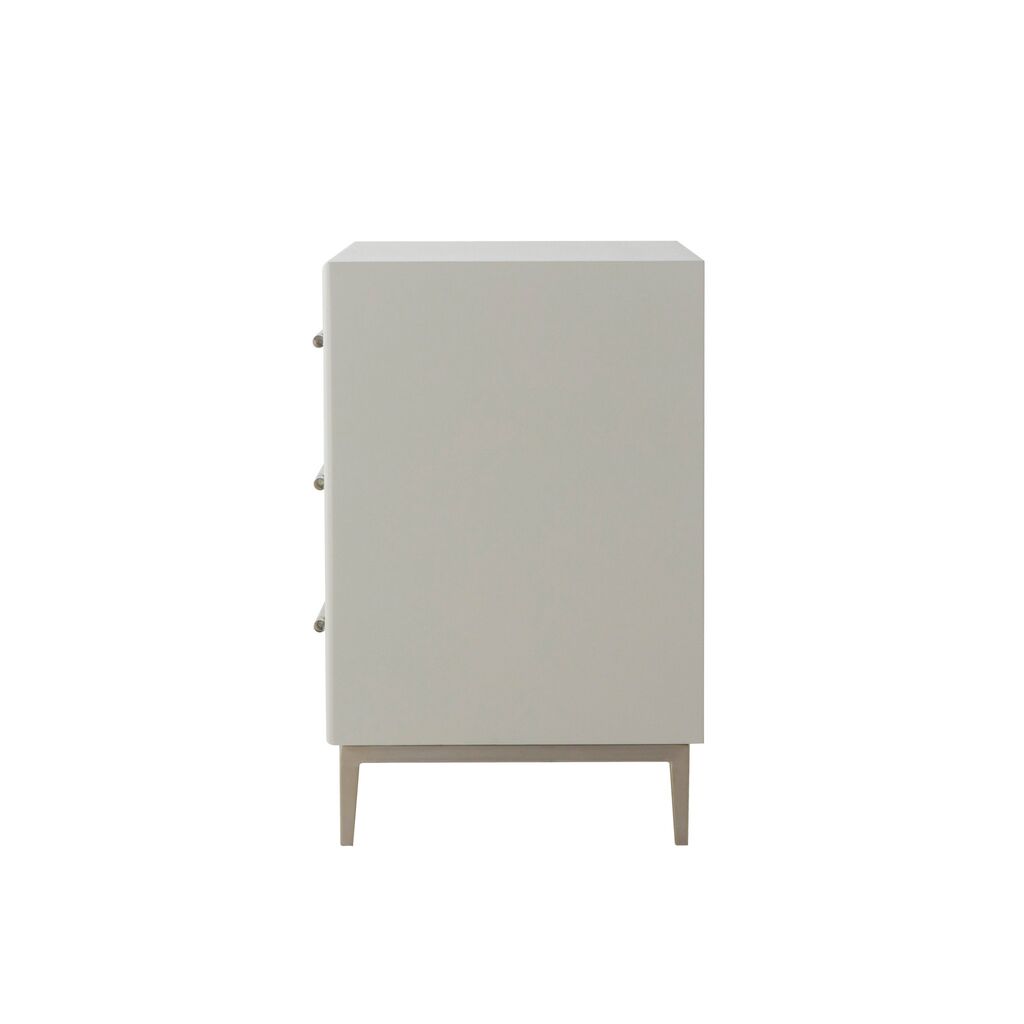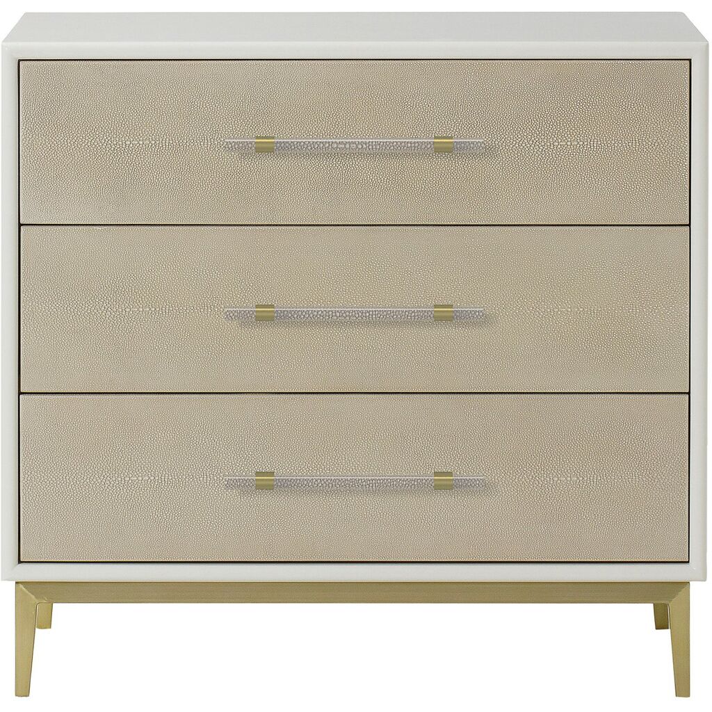 Stylishly formed; this three-drawer nightstand is a versatile piece for both contemporary and traditional interiors. The elegant metal frame contrasts perfectly with luxurious faux shagreen drawer fronts. Solid perspex handles complete its look giving it an extra chic touch. Pairs particularly well next to the Alice Bed. Due to the nature of shagreen, the coloring may vary from one piece to another, these differences add to the natural beauty of the product. The color may also vary with time.