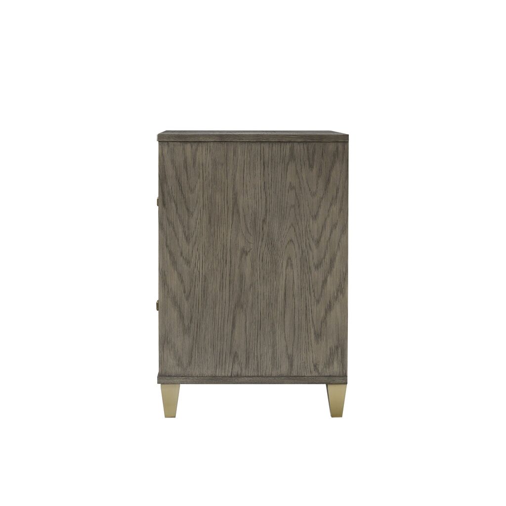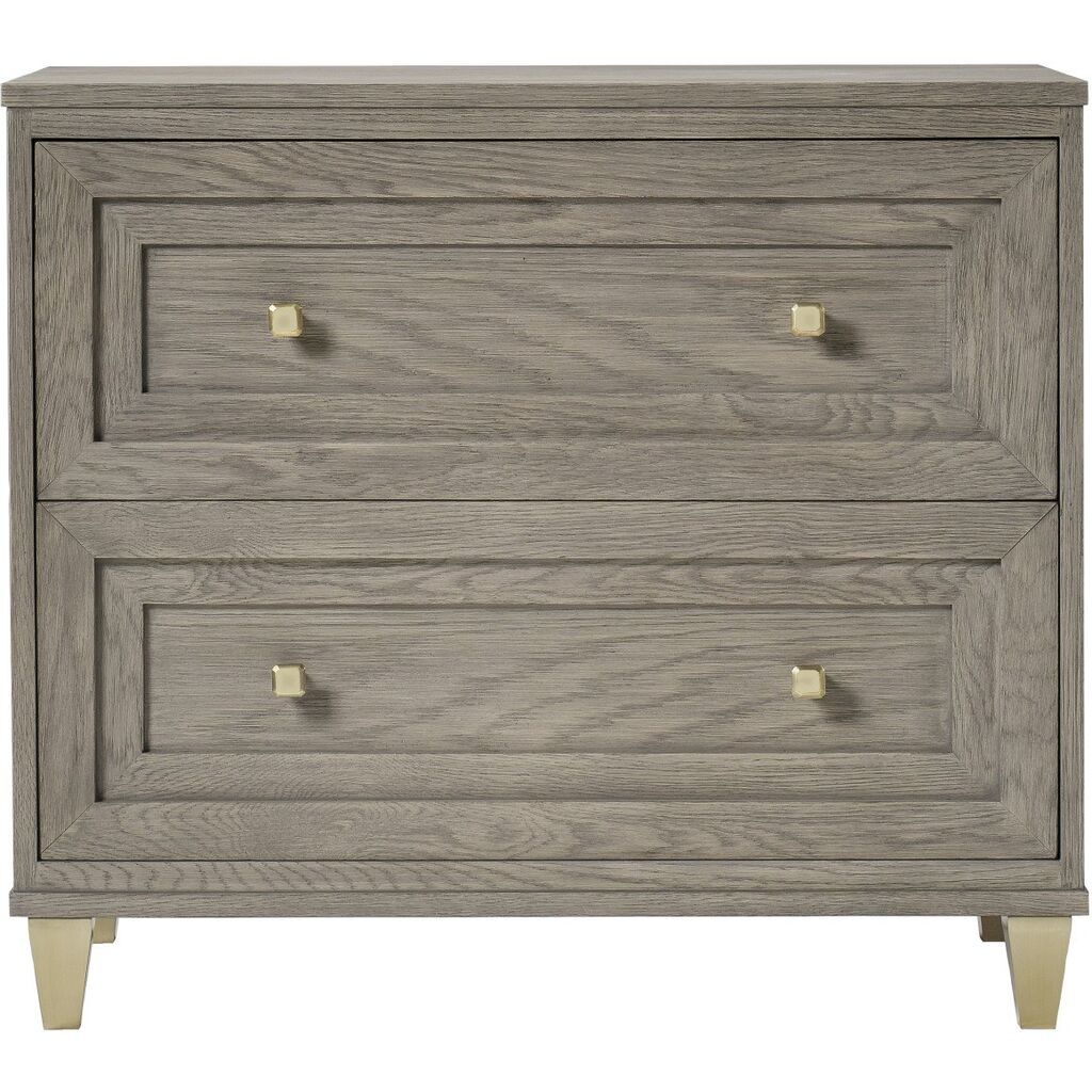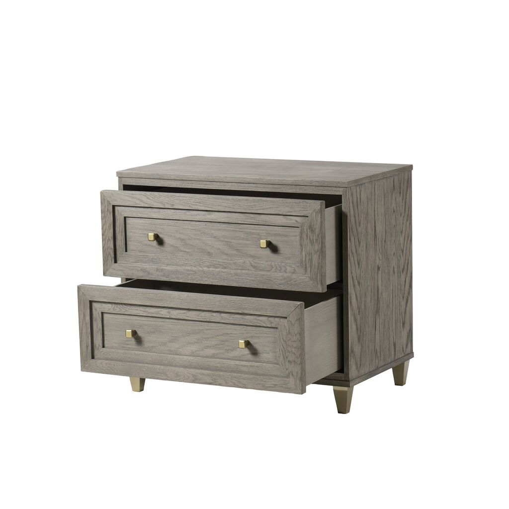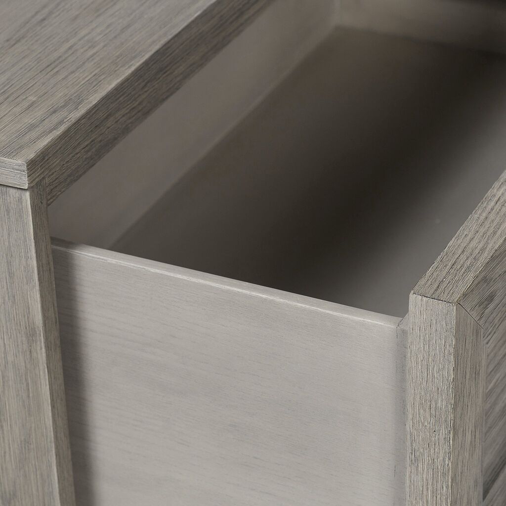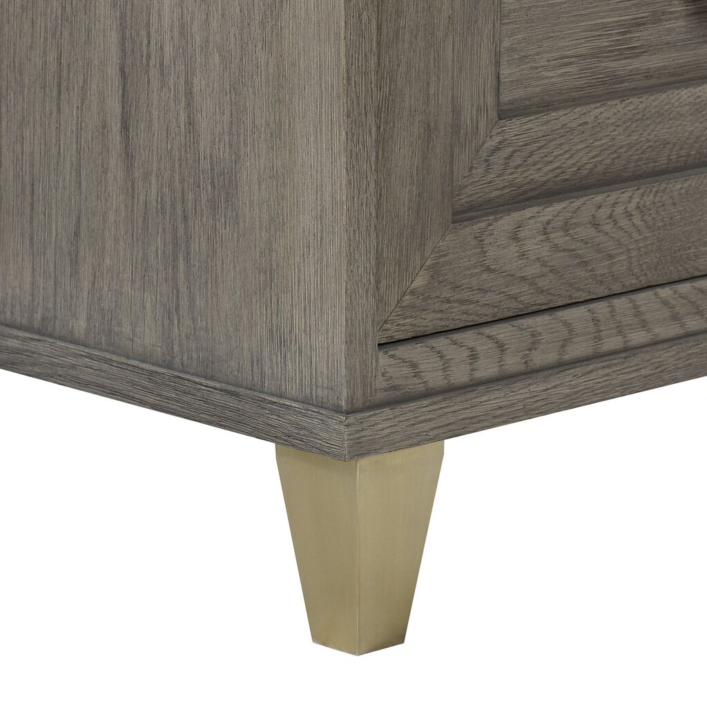 Part of the Claiborne Collection, this piece alludes to a relaxed, casual aesthetic, constructed of open grain oak solids and veneers, featuring architectural layered framed doors that graduate to give a multi-step shadow box look. Faceted handles and square tapered feet are finished in a satin brass that contrasts nicely against the quartered oak, in a weathered taupe finish named Pebble gray.