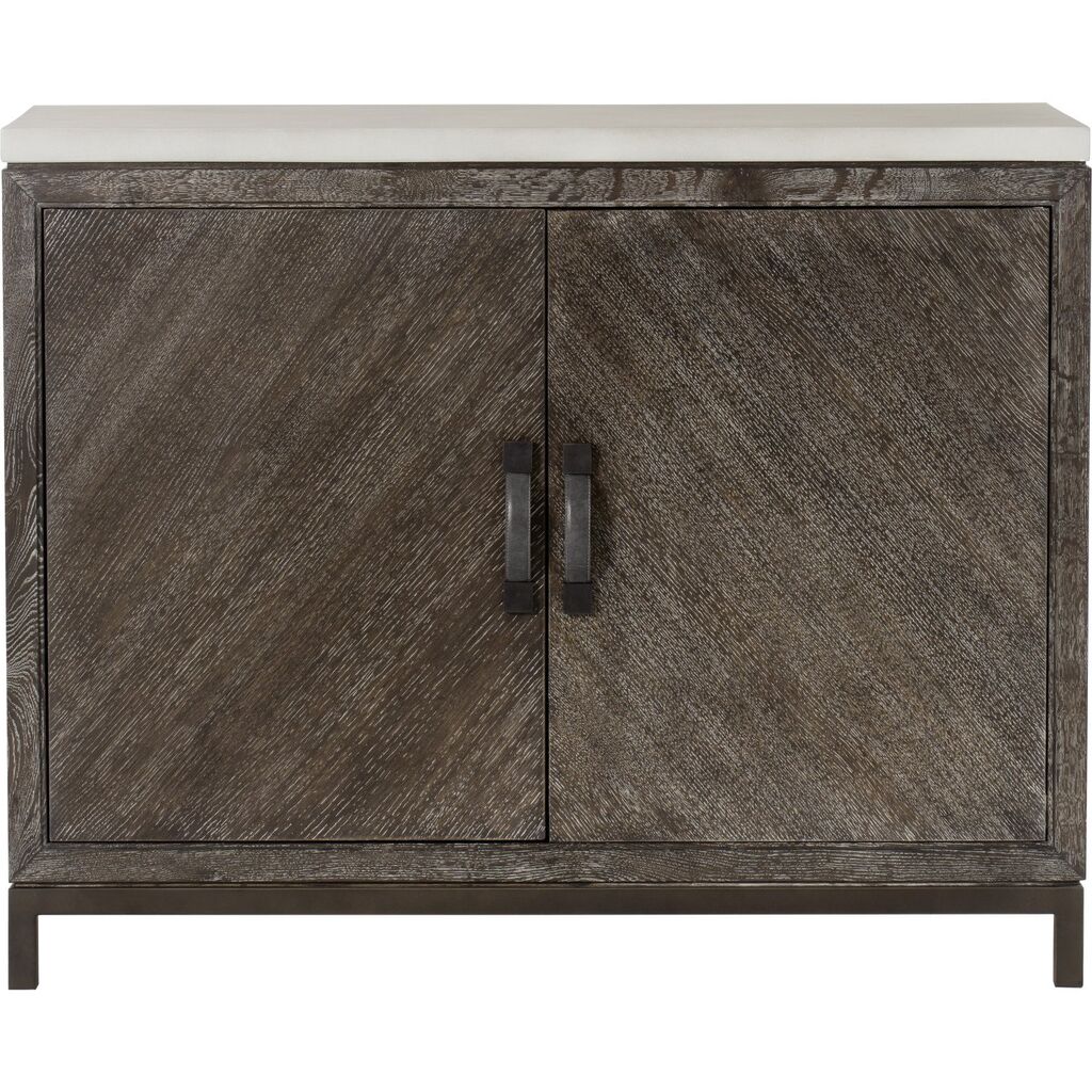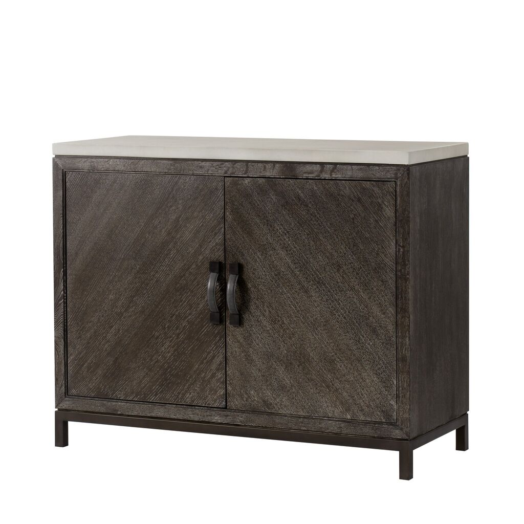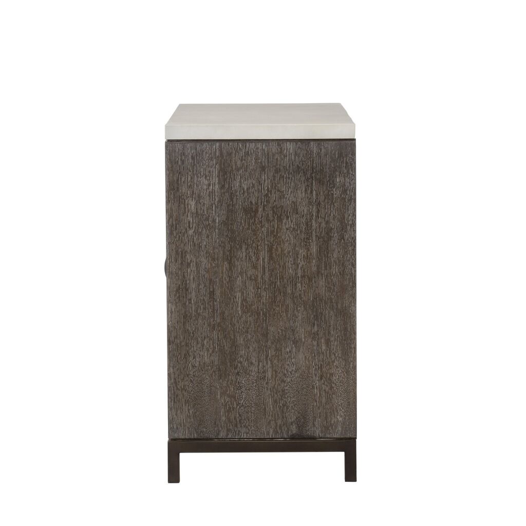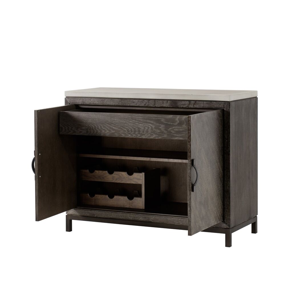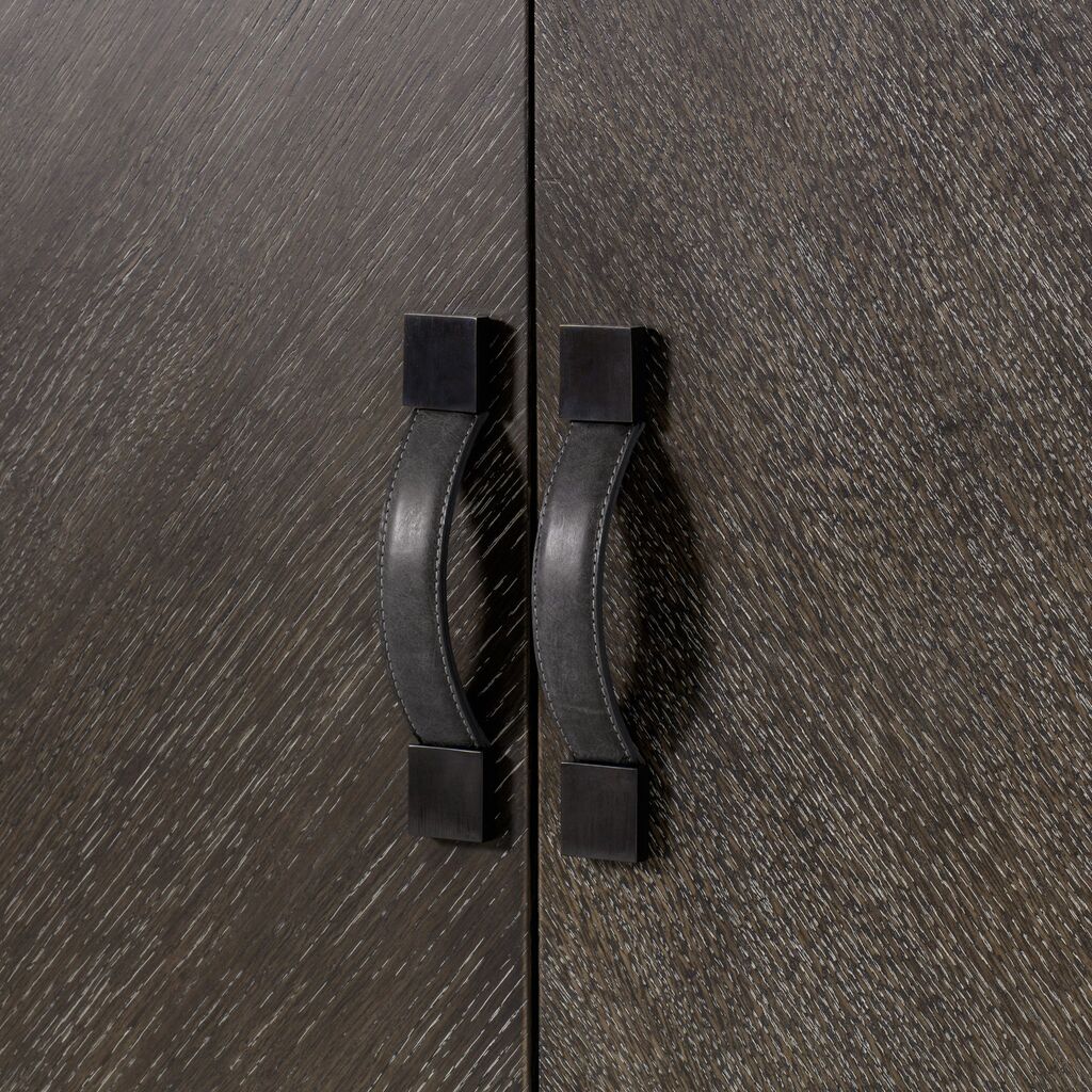 Exuding a modern, relaxed elegance; this handcrafted credenza is made from a combination of hardwoods contrastic with a contemporary white concrete effect, and a square tube frame crafted from steel in a bronze finish, adds a striking twist to this piece, while stitched leather door handles add a touch of old-world glamor. The top drawer is lined with felt, and fitted with a removable cutlery tray, for modern convenience.?