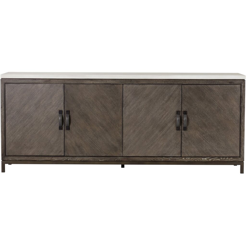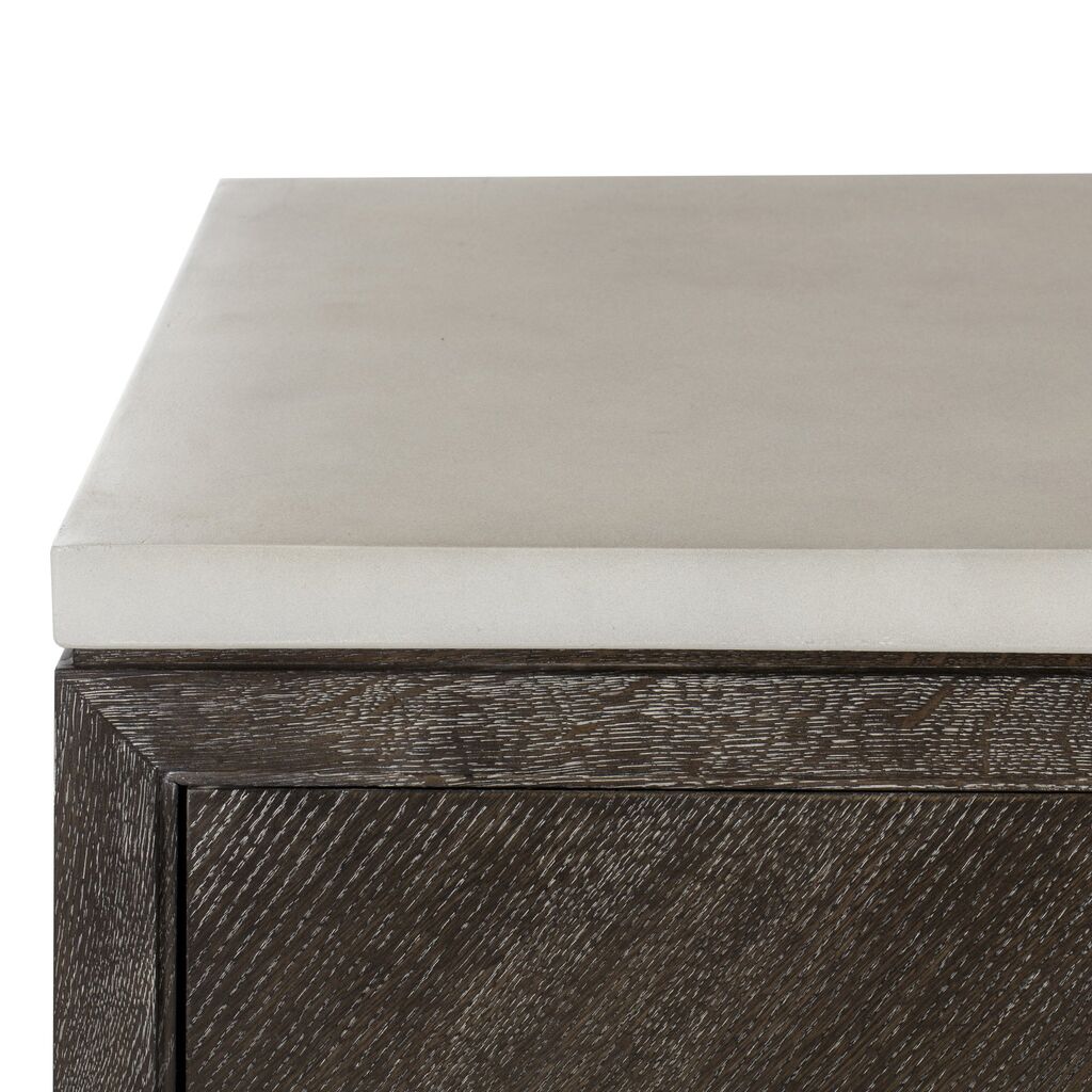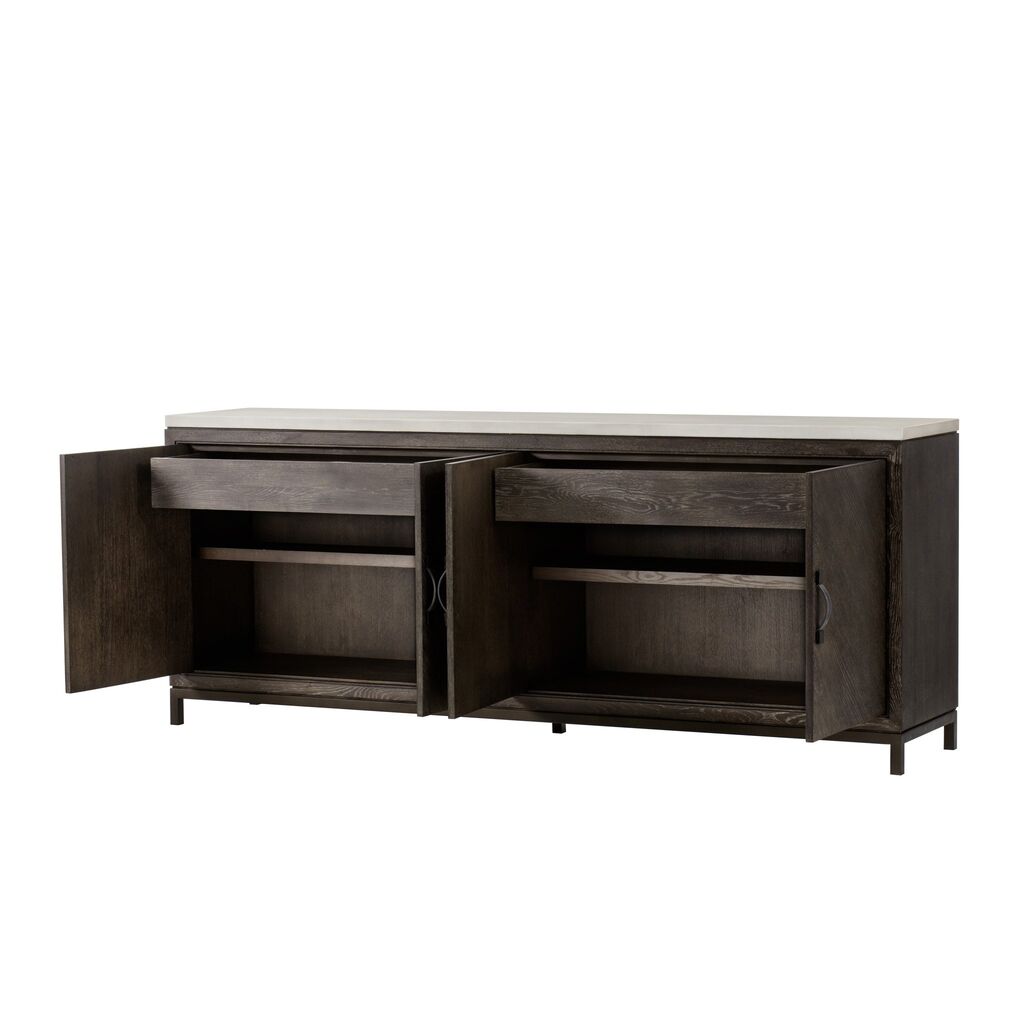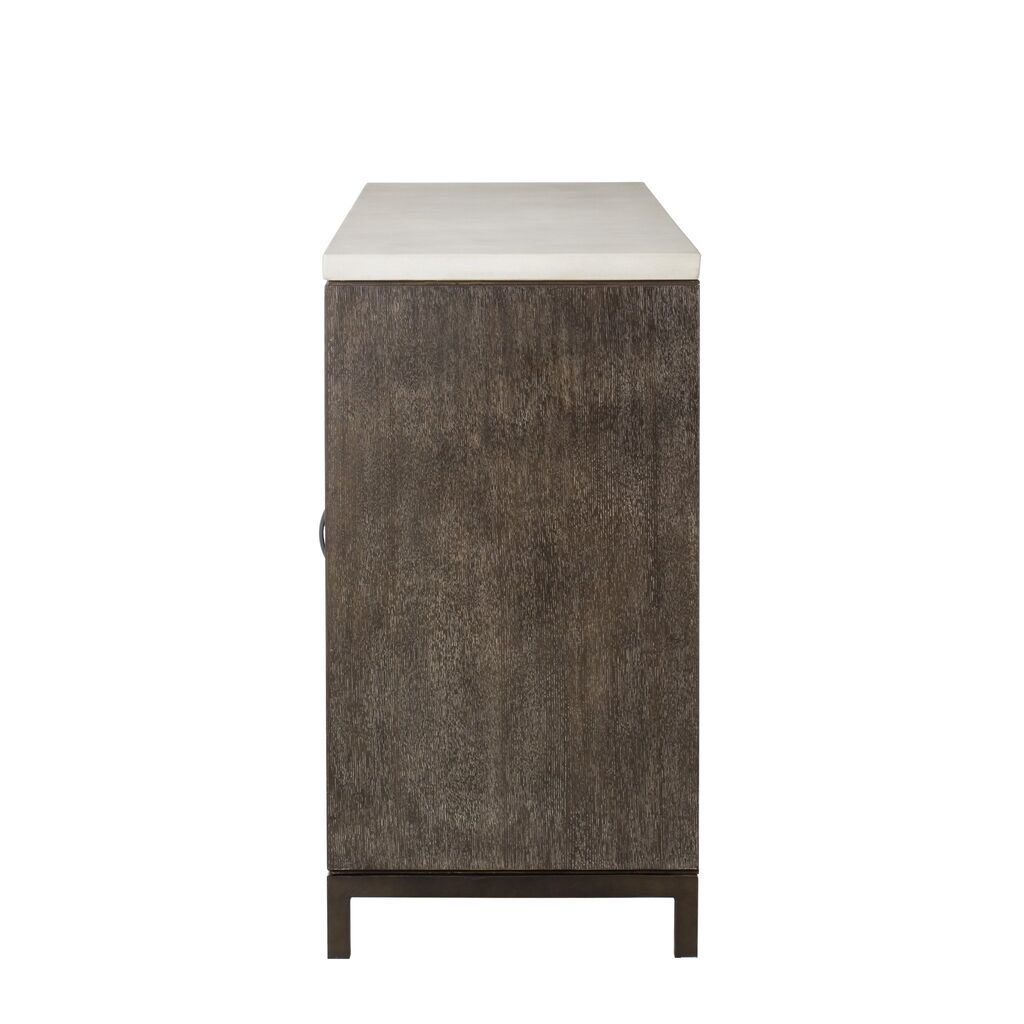 Exuding a modern, relaxed elegance; this handcrafted credenza is made from a combination of hardwoods contrastic with a contemporary white concrete effect, and a square tube frame crafted from steel in a bronze finish, adds a striking twist to this piece, while stitched leather door handles add a touch of old-world glamor. The top drawer is lined with felt, and fitted with a removable cutlery tray, for modern convenience.?
