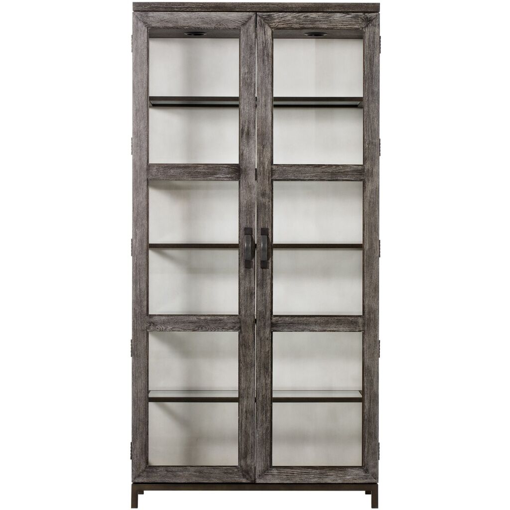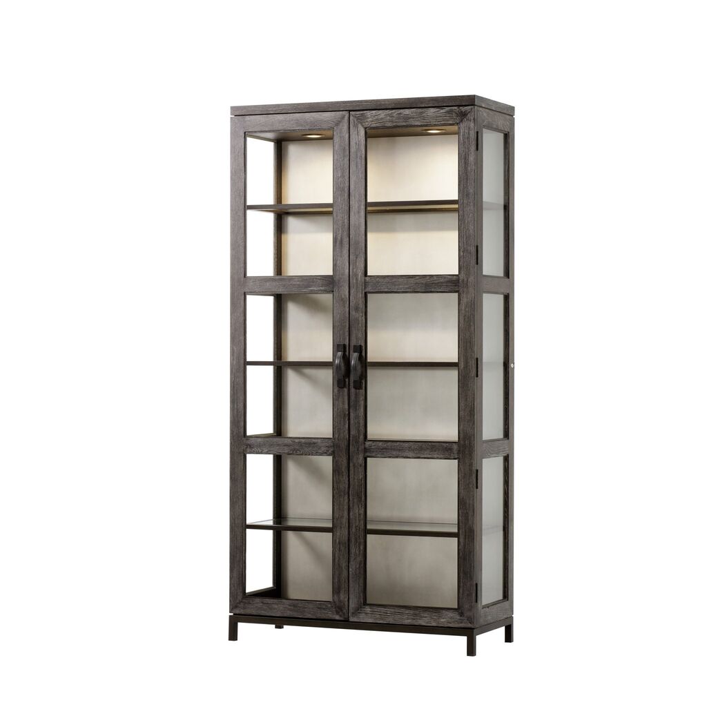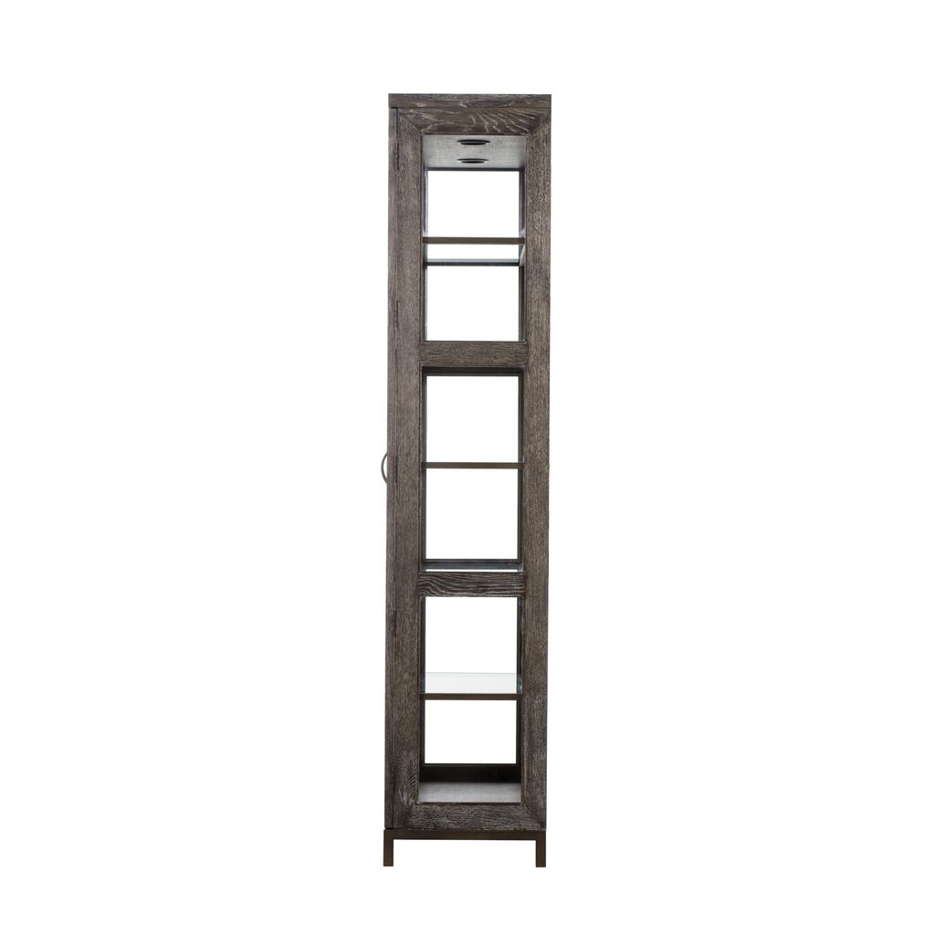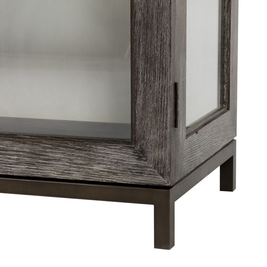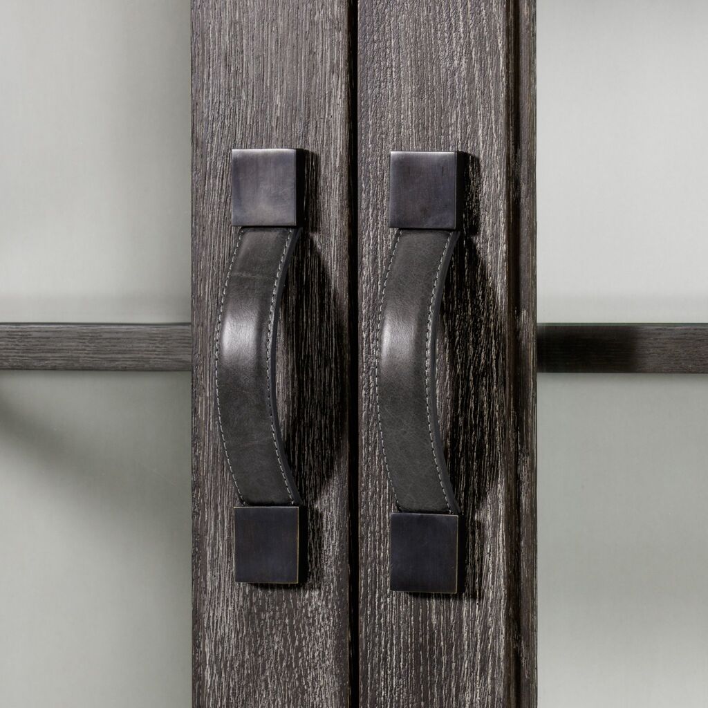 Handcrafted from a combination oak and finished in a rich, dark chocolate cerused umber stain, this cabinet exudes modern, relaxed elegance. A square tube frame crafted from bronze finished steel adds a striking twist to this piece, while stitched leather door handles add a touch of old-world glamor. Glass shelves with a contrasting wood trim allow light to shine through, cast down from the internal spotlights at the top of the cabinet.