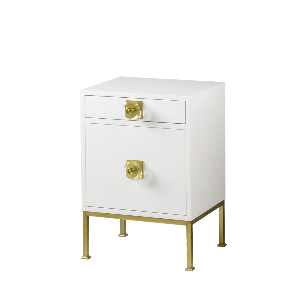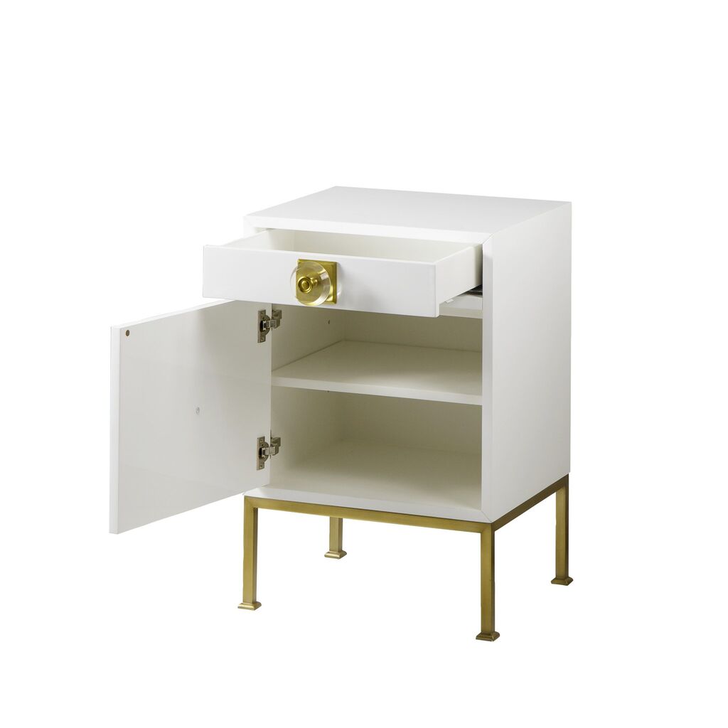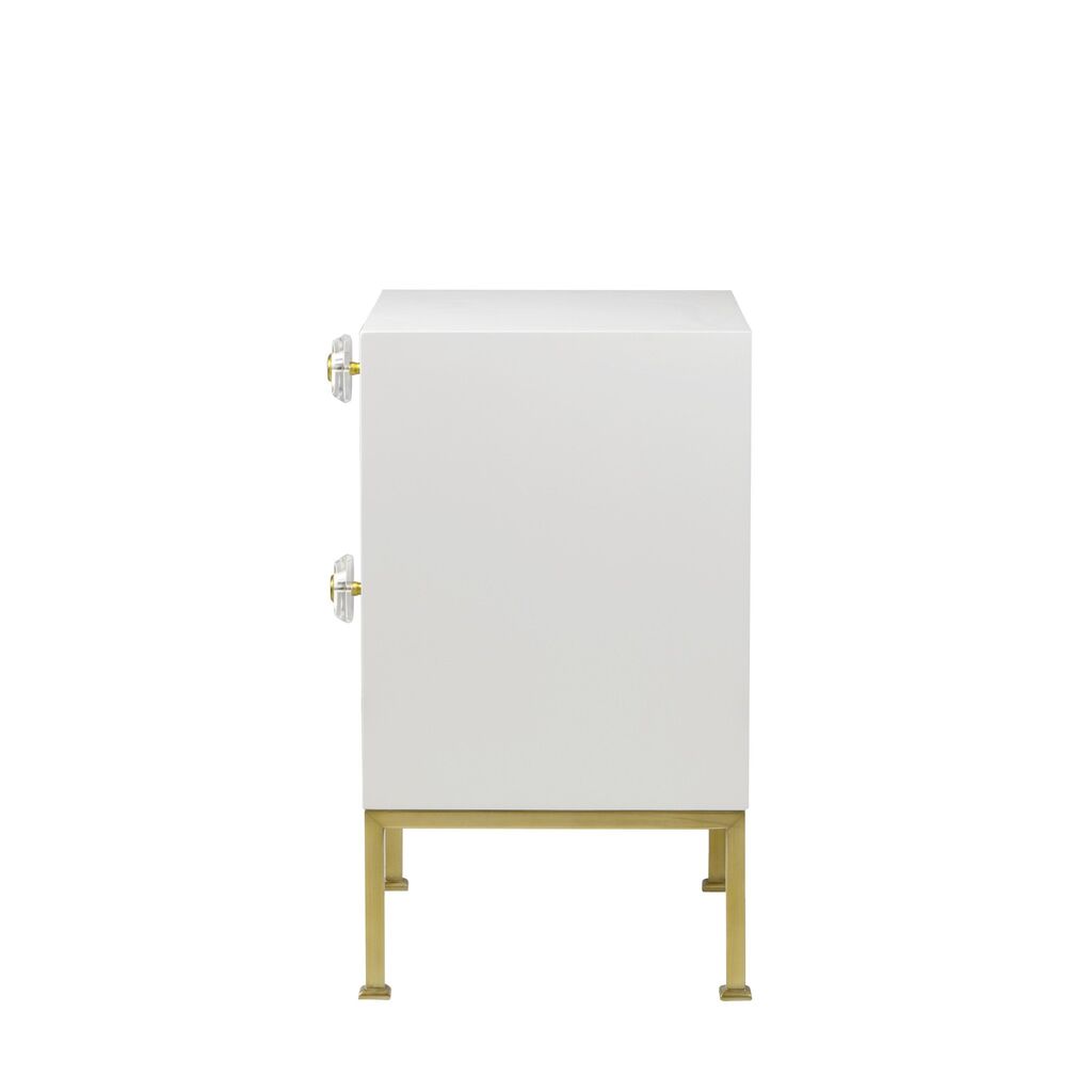 An elegant two-door nightstand finished in a semi-gloss white lacquer, accented with Lucite and brass handle details.