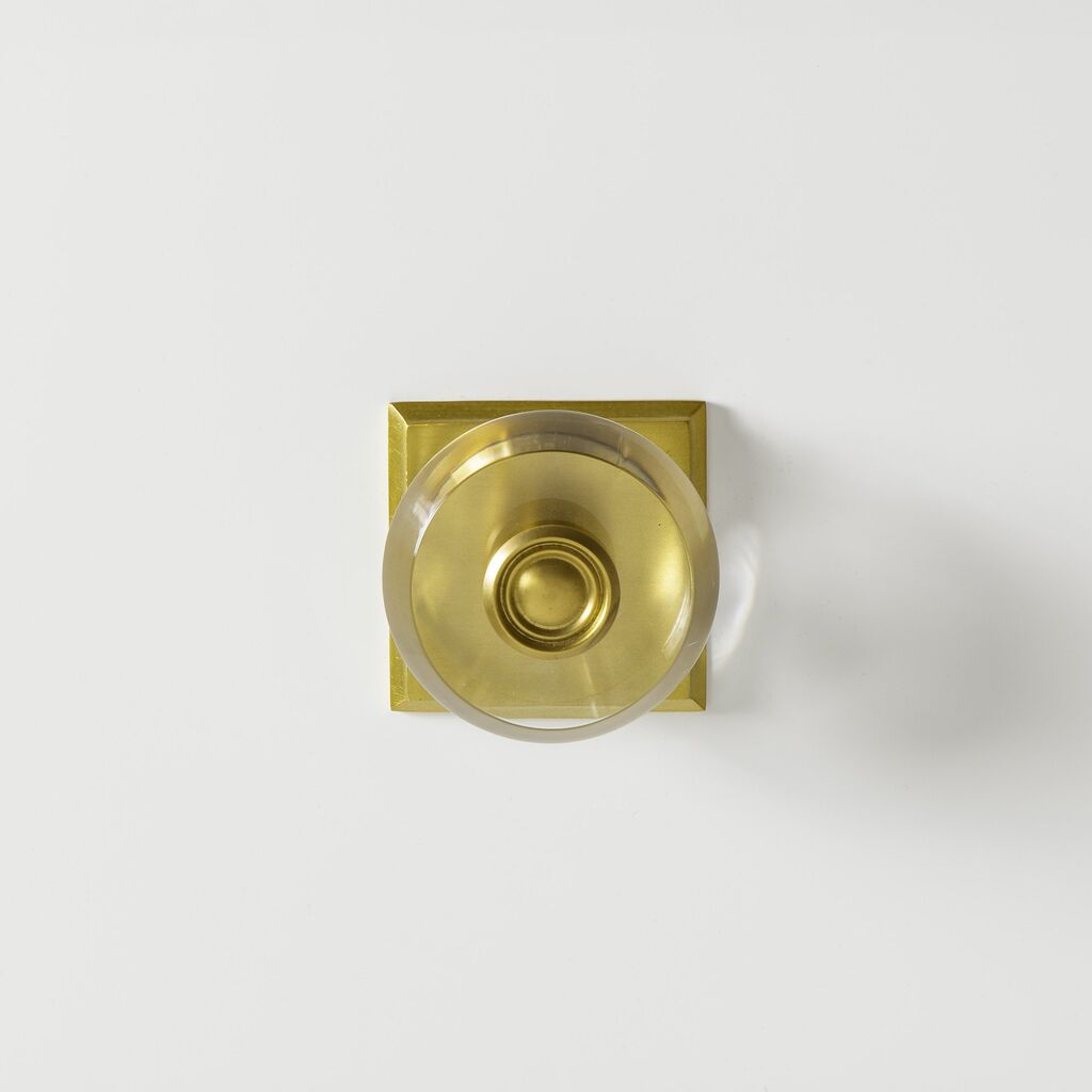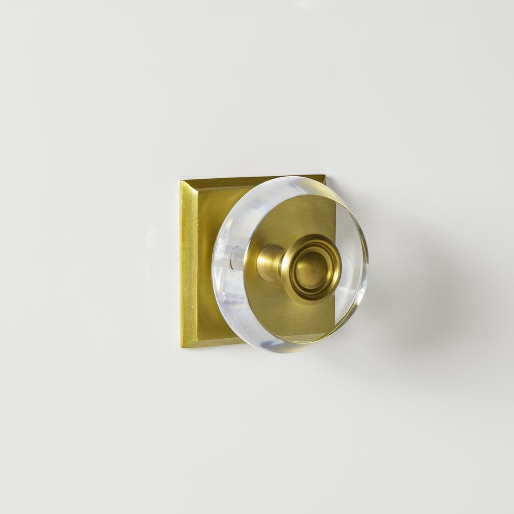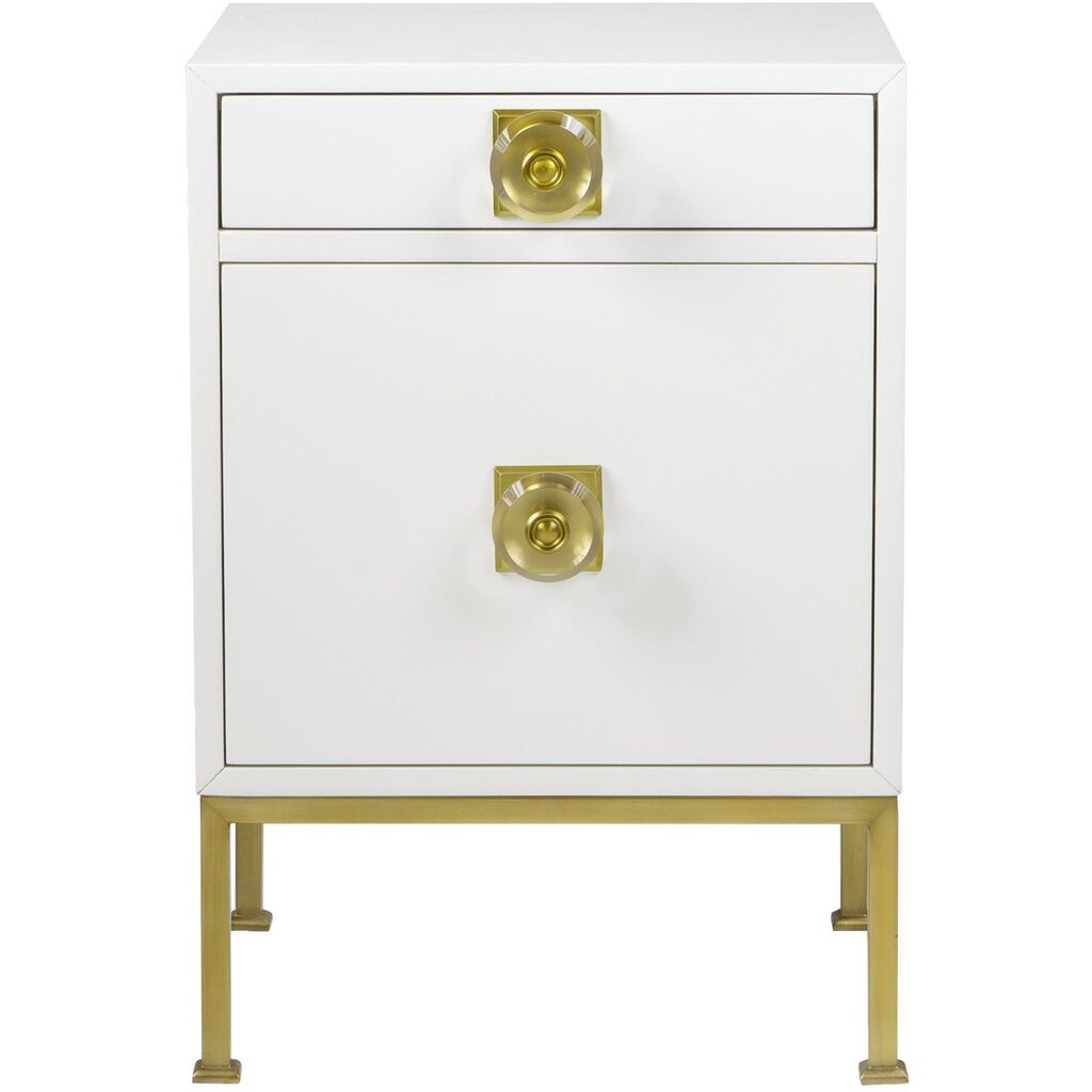 An elegant two-door nightstand finished in a semi-gloss white lacquer, accented with Lucite and brass handle details.