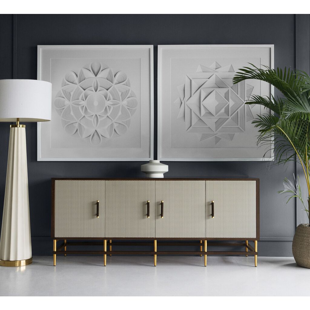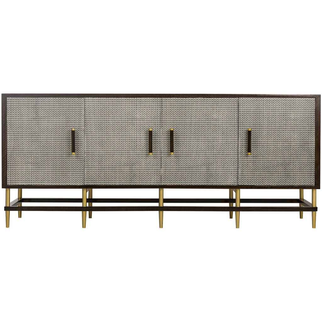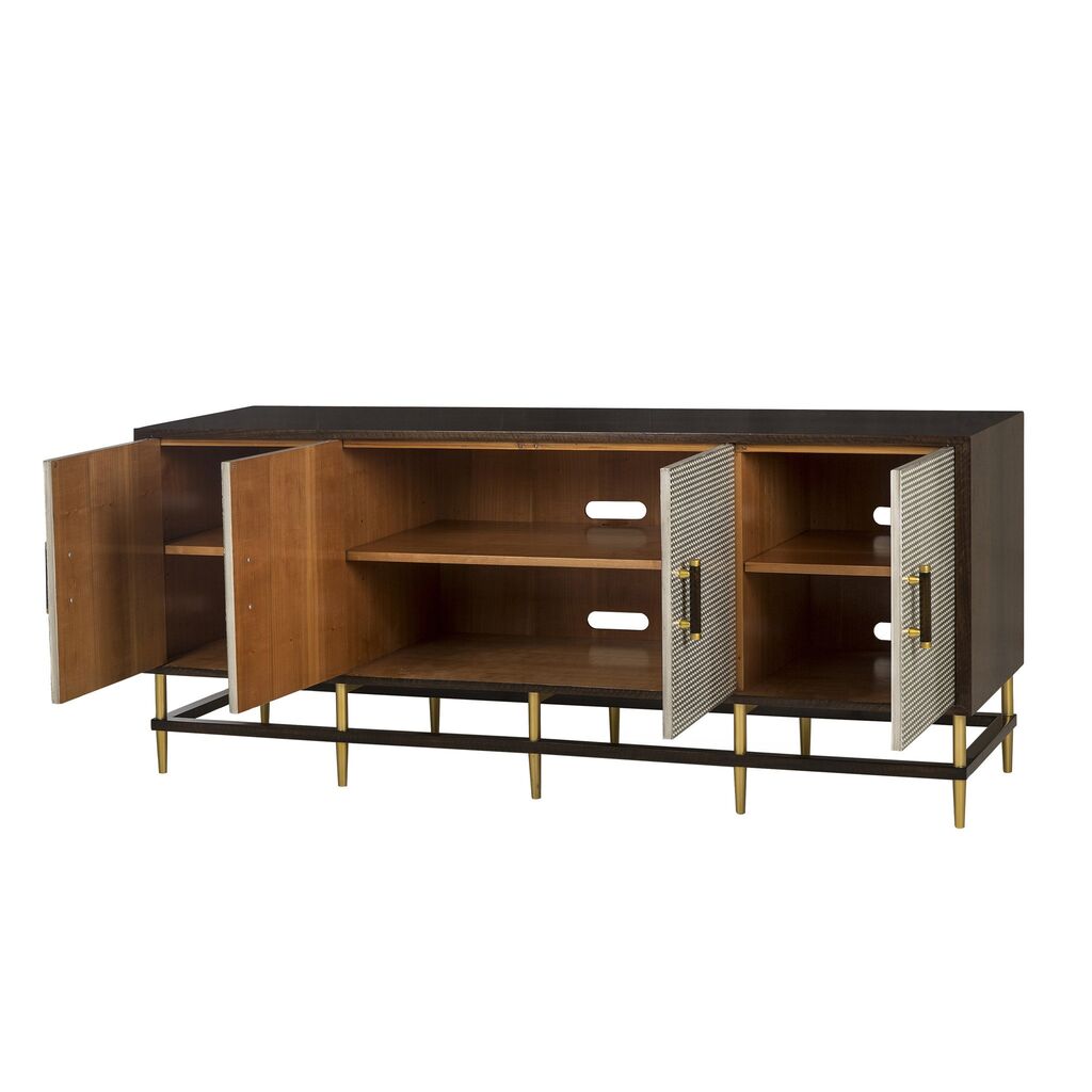 This classic credenza features herringbone printed door fronts and cherry veneer interior frame, accented with subtle brass hardware. Adjustable shelves and internal cable management make this a versatile piece for the home.