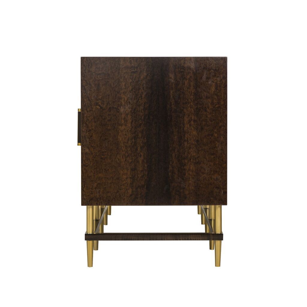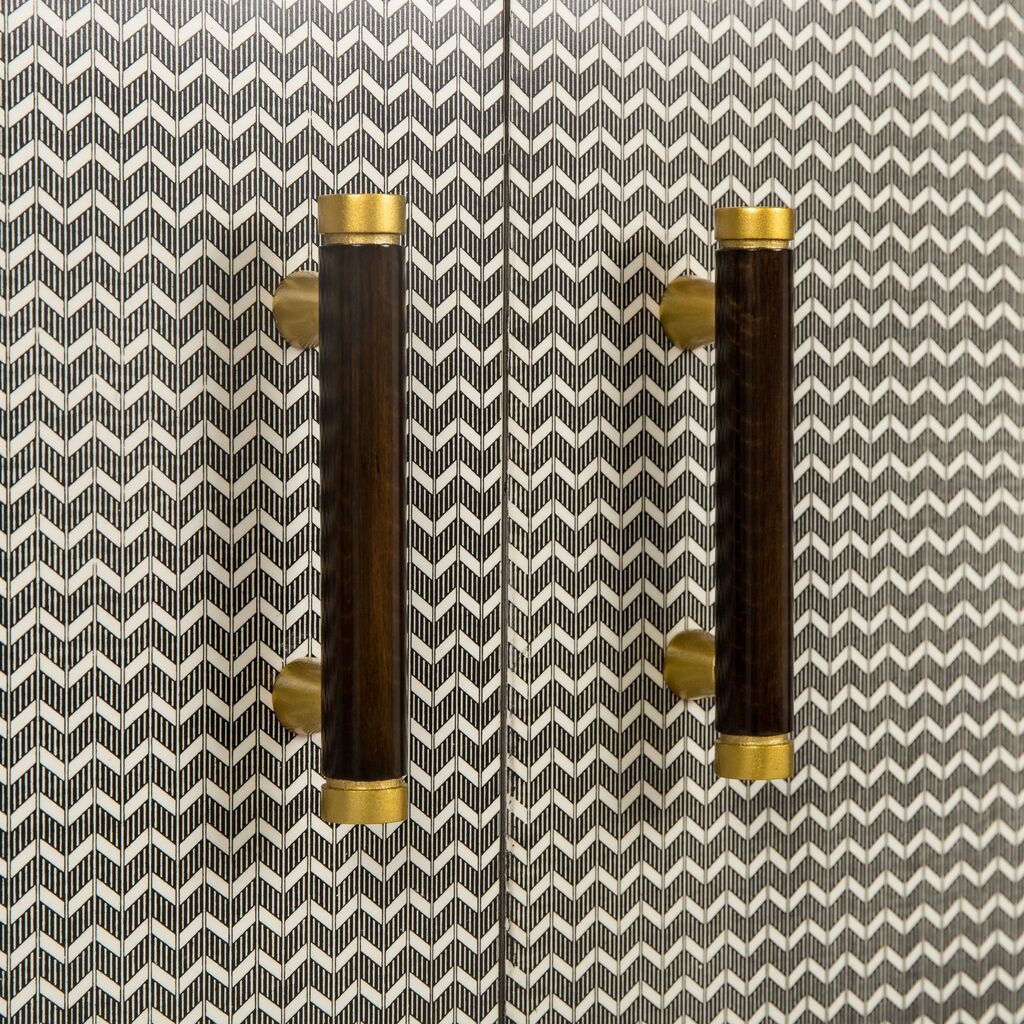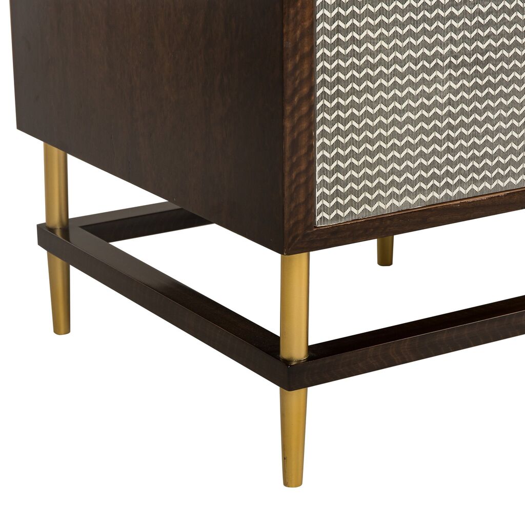 This classic credenza features herringbone printed door fronts and cherry veneer interior frame, accented with subtle brass hardware. Adjustable shelves and internal cable management make this a versatile piece for the home.