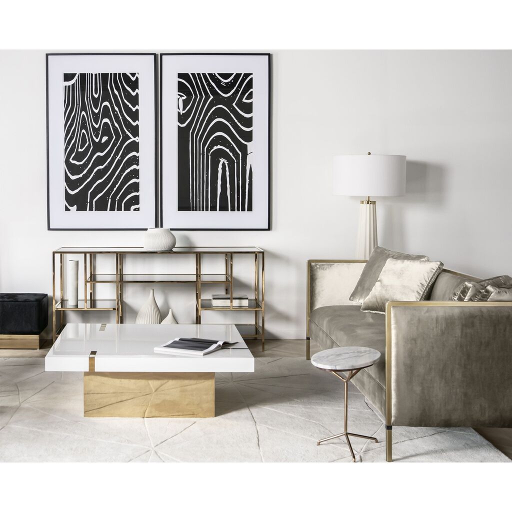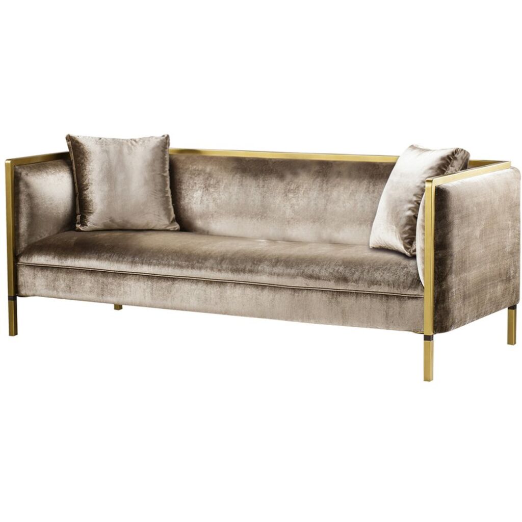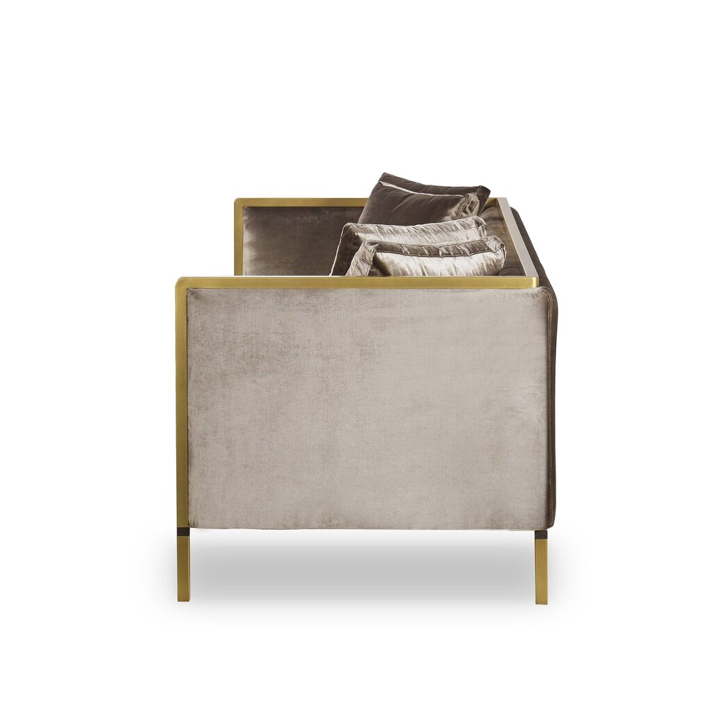 A modern interpretation of sofas typically found in classic drawing rooms of stately English homes. This contemporary and elegant piece is upholstered in a high sheen fabric, complemented by an exposed brass finished steel frame with subtle dark stained oak veneer detailing.