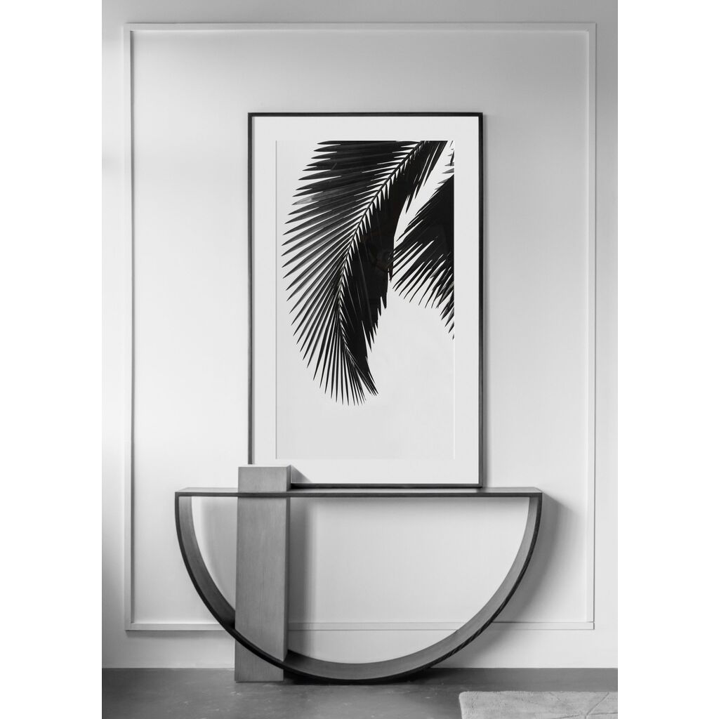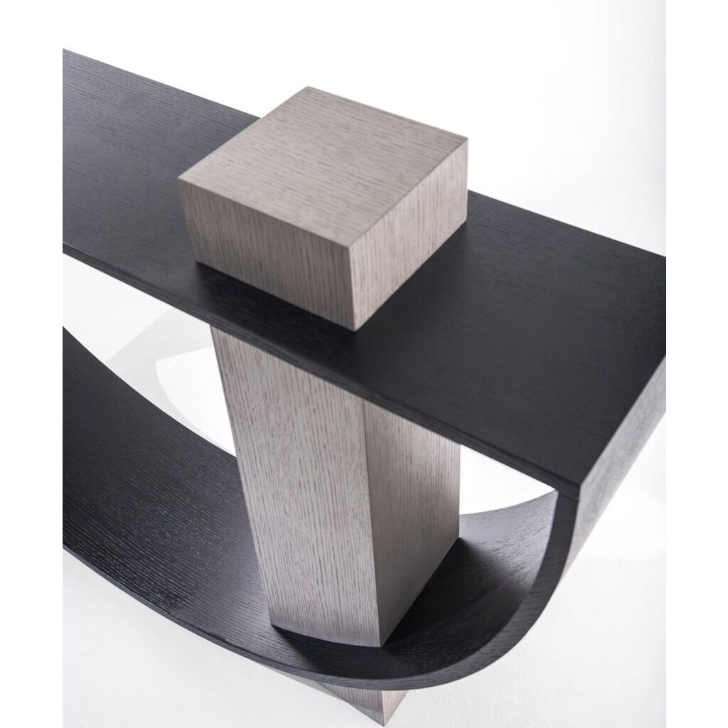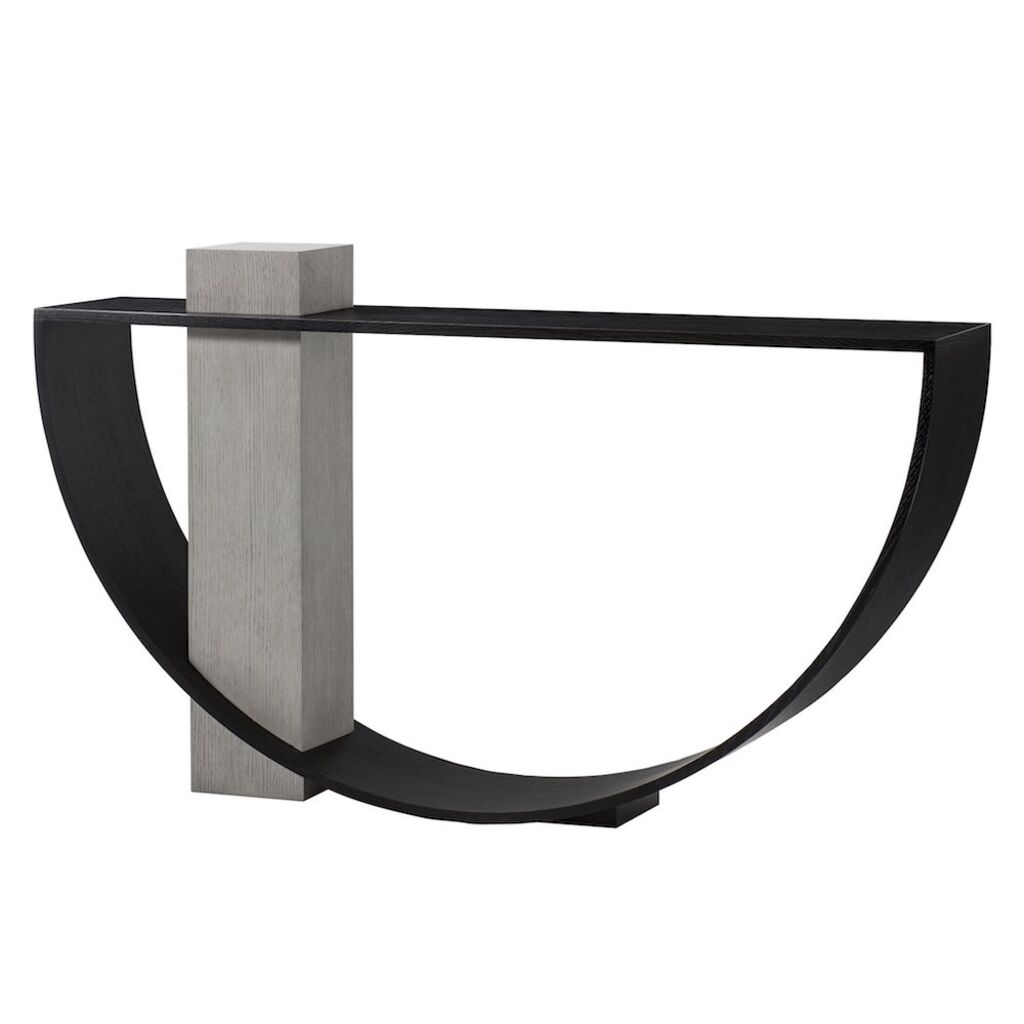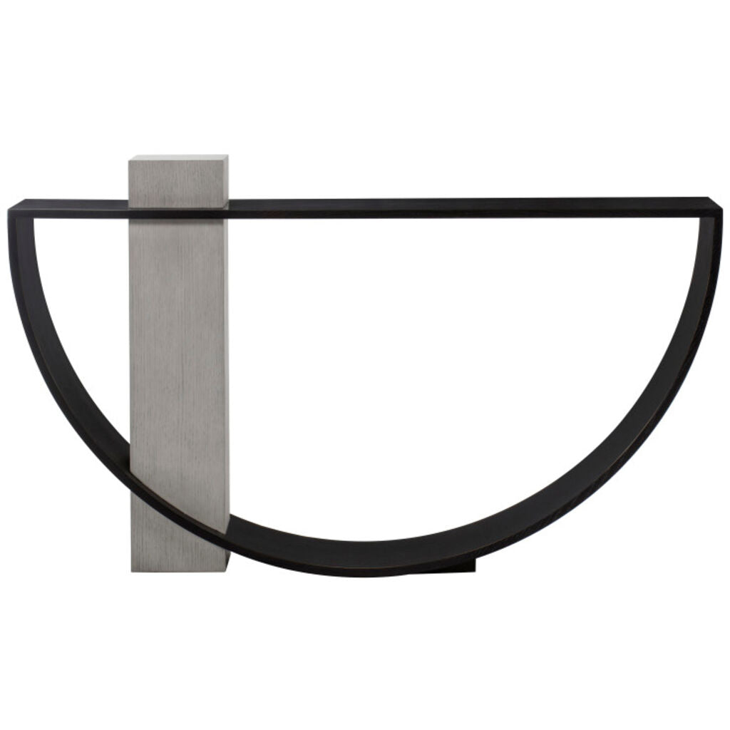 This sleek minimalist contemporary console table strikes as a conversational piece. Its half-moon shape frame has an open grain finish displaying textured black oak, contrasted with an intersecting taupe oak column.