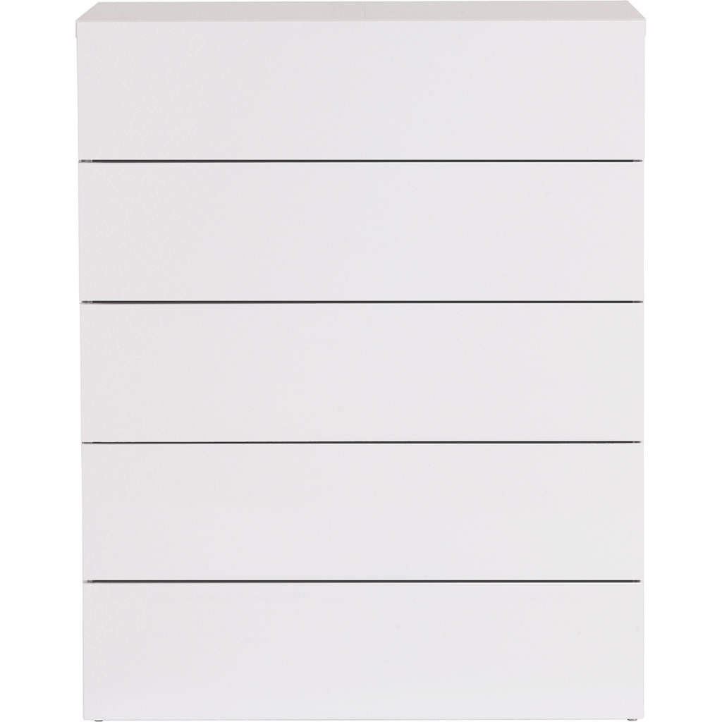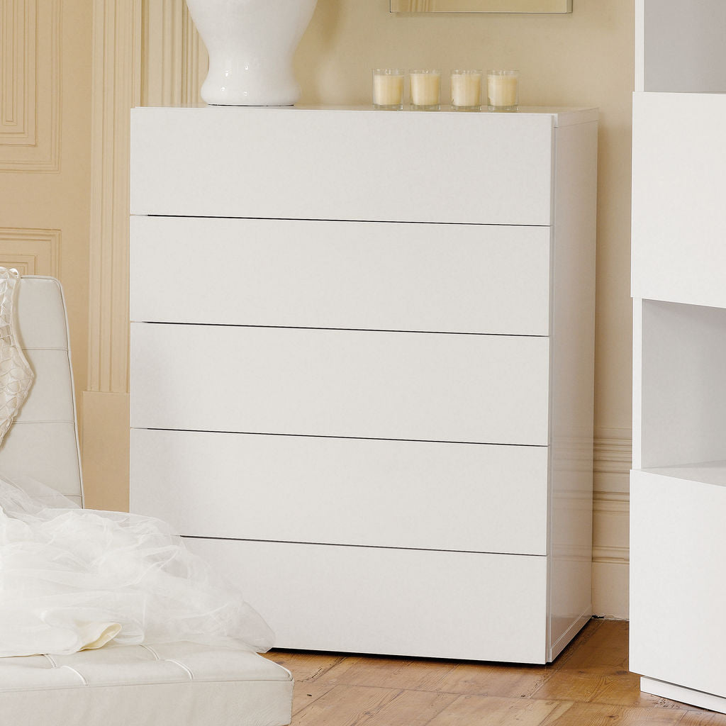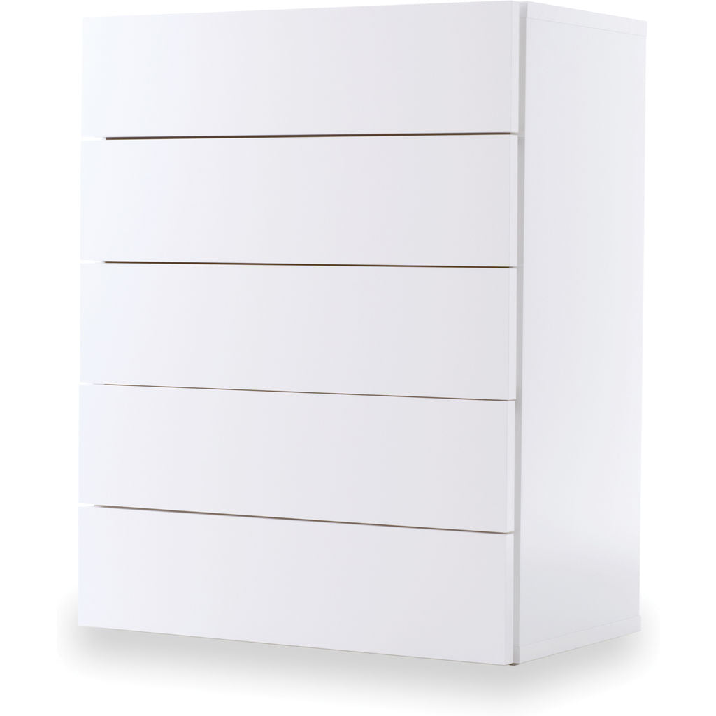 TemaHome's Aurora Collection offers affordable bedroom case goods that boast a��compact��exterior, spacious�� interior and striking aesthetics. Distilled to completely purge away all excess, the form of the White Aurora Chest exclusively contains functional components. With five separate drawers of the same generous volume, the Aurora has the capacity to help you organize any living space.��