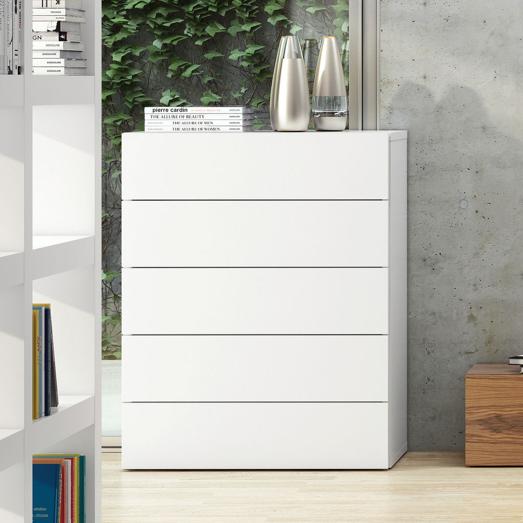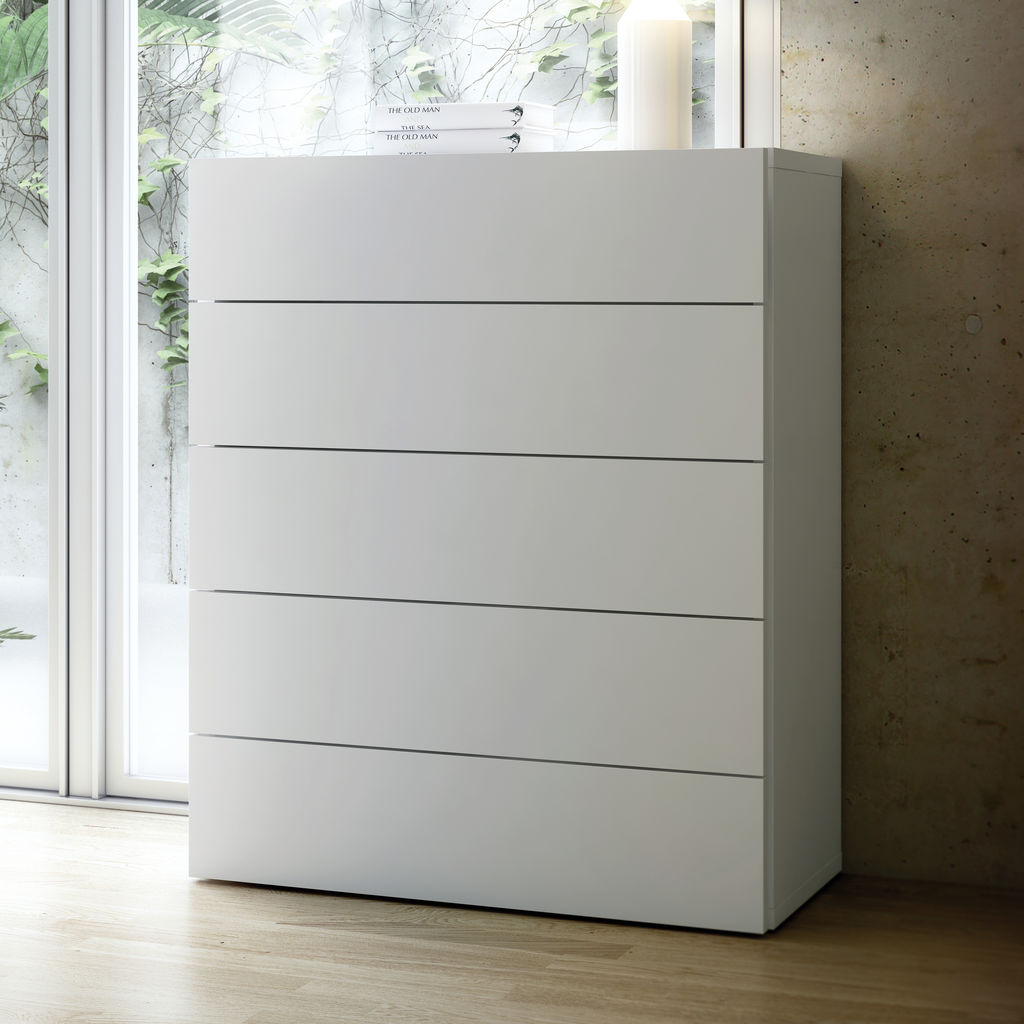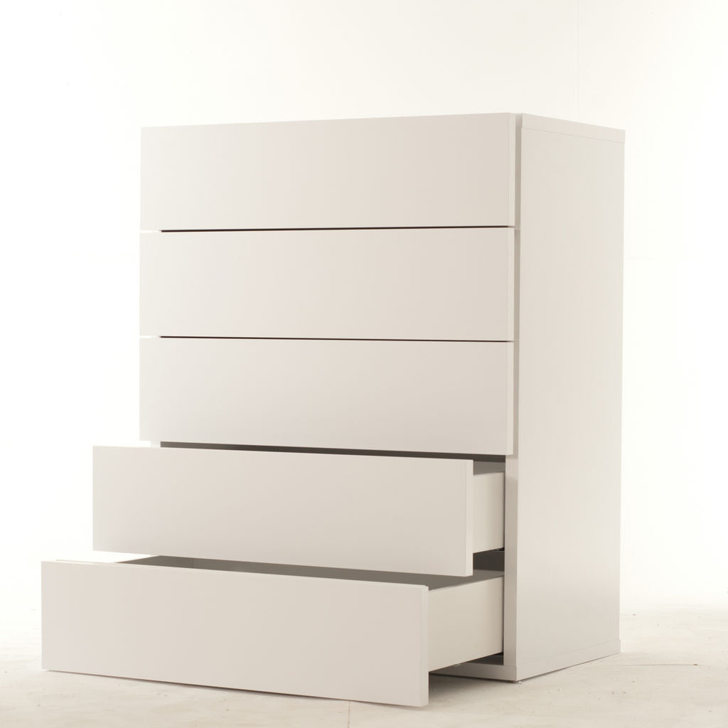 TemaHome's Aurora Collection offers affordable bedroom case goods that boast a��compact��exterior, spacious�� interior and striking aesthetics. Distilled to completely purge away all excess, the form of the White Aurora Chest exclusively contains functional components. With five separate drawers of the same generous volume, the Aurora has the capacity to help you organize any living space.��