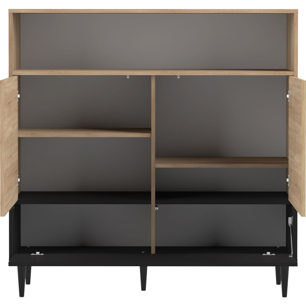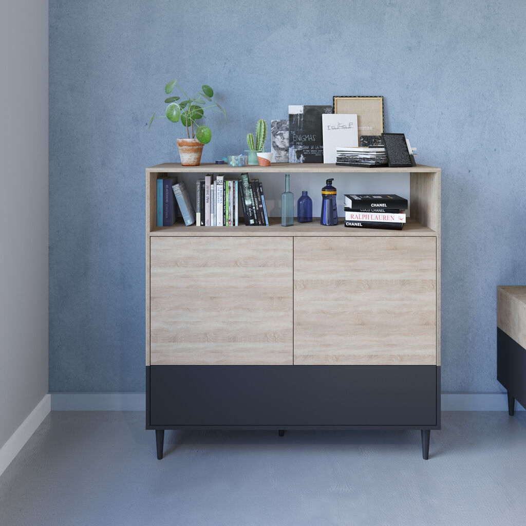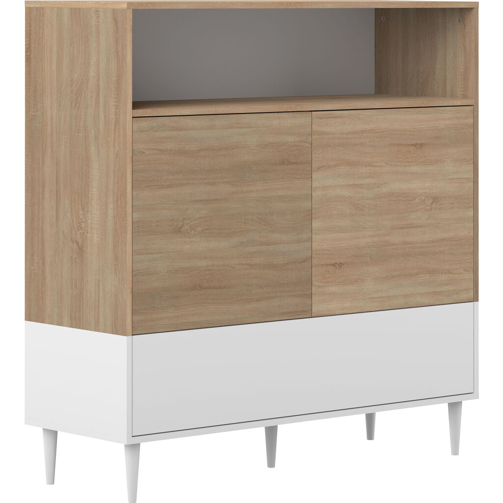 HORIZON collection mid-high sideboard with solid beech tapered feet, storage space closed by two doors and one flap, one open niche. This stylish horizon mid-high sideboard is made of melamine chipboard. Enjoy it anywhere you need a sideboard.