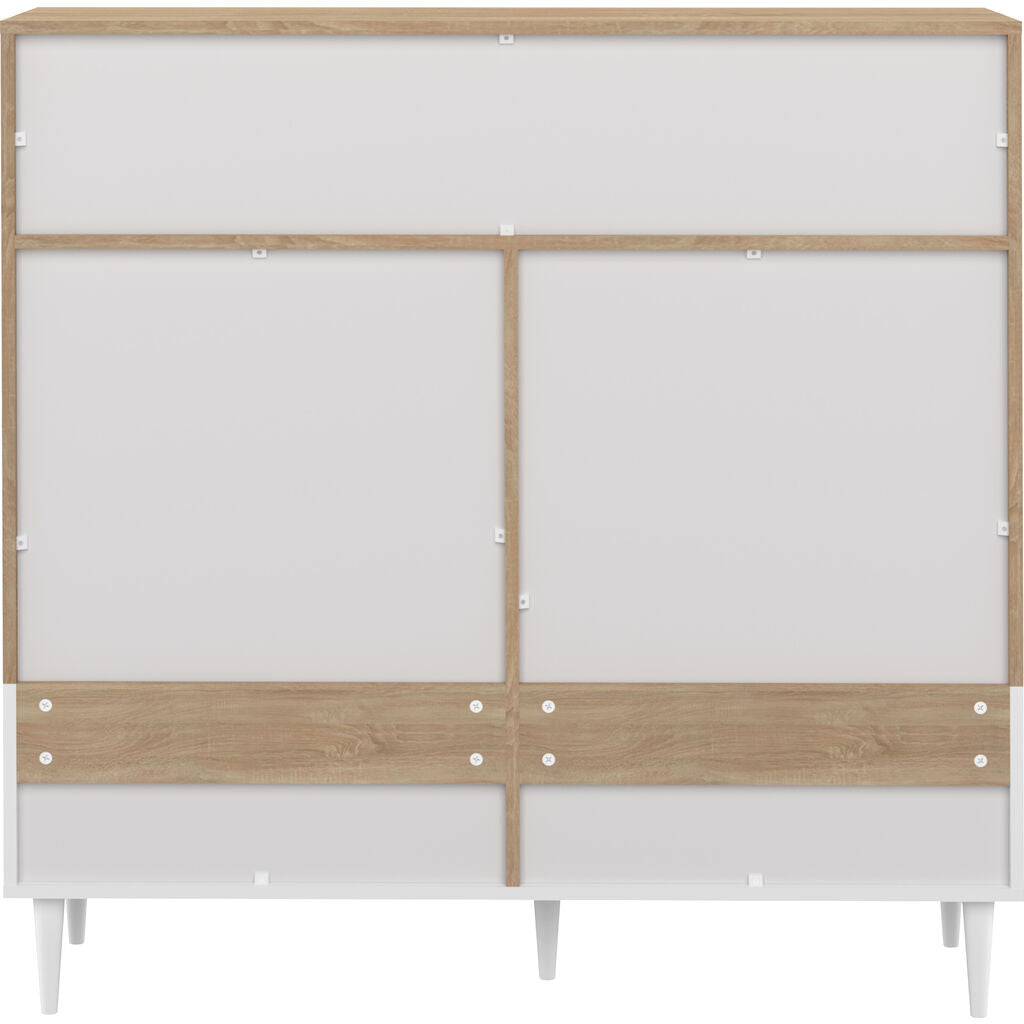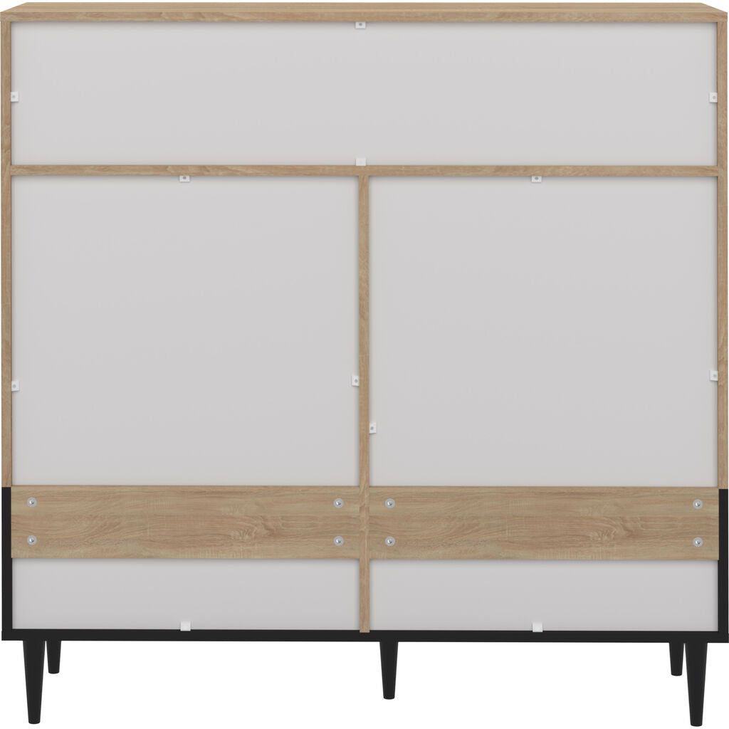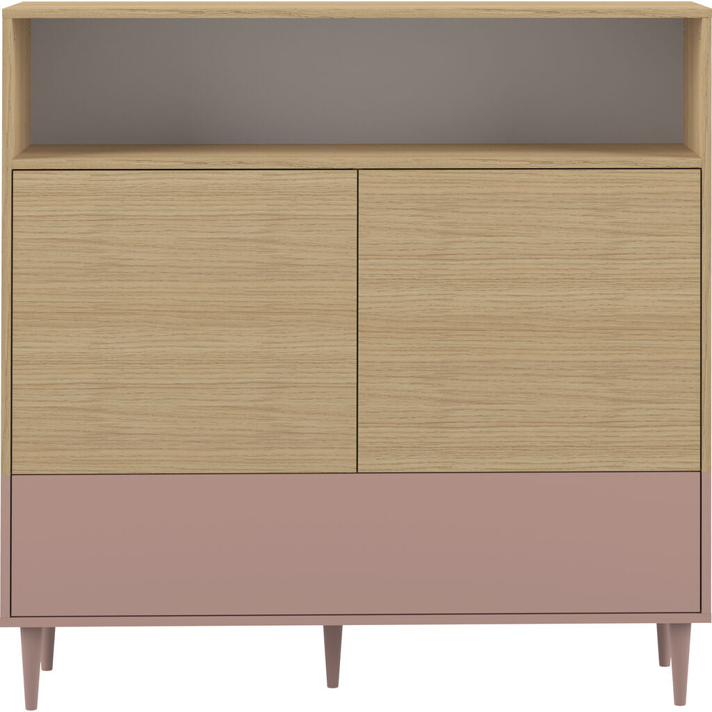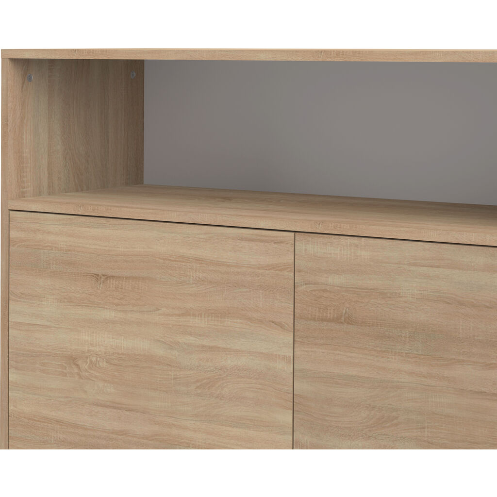 HORIZON collection mid-high sideboard with solid beech tapered feet, storage space closed by two doors and one flap, one open niche. This stylish horizon mid-high sideboard is made of melamine chipboard. Enjoy it anywhere you need a sideboard.