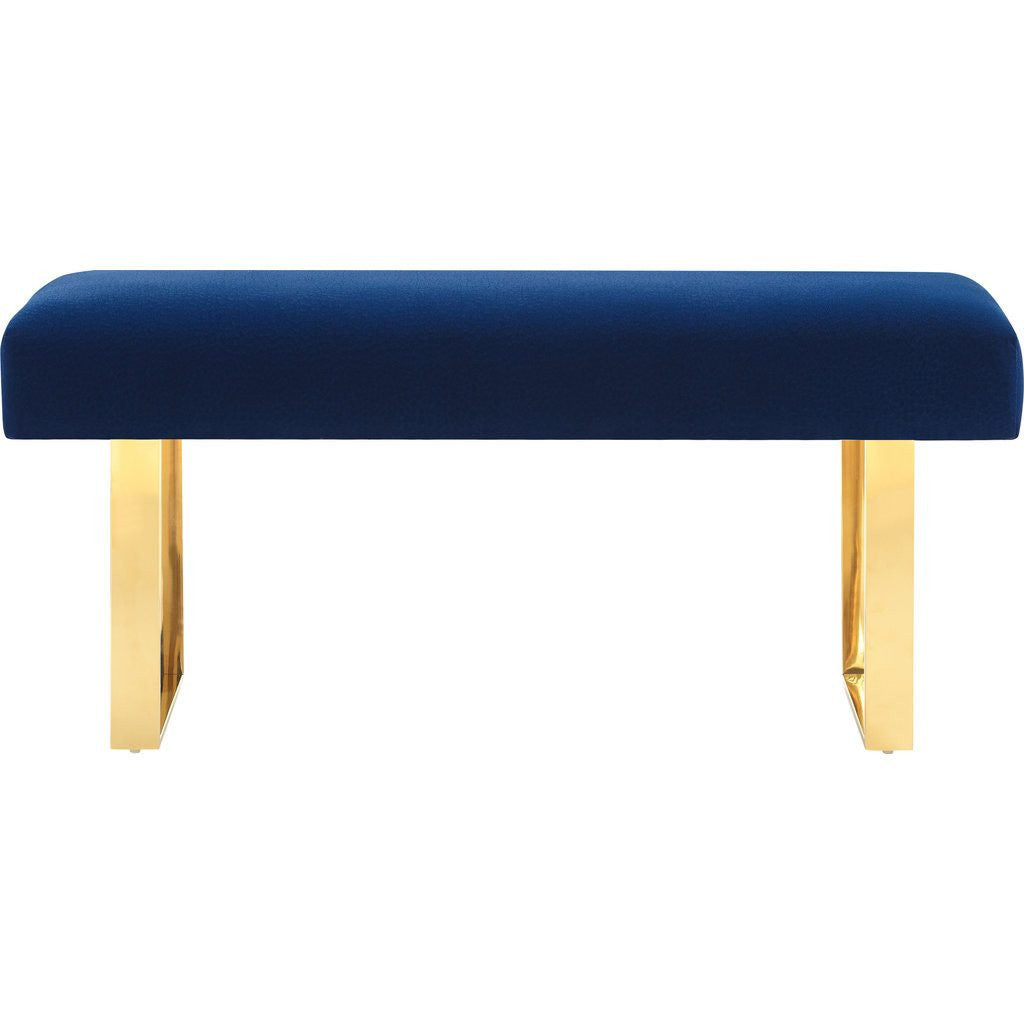 Turn up the glam with the blue velvet Alexis Bench on bold gold legs. This piece of furniture perfectly combines modern glamour and minimalist design. The navy velvet upholstery is a trademark of the TOV Furniture brand, completing the bold, glam look.