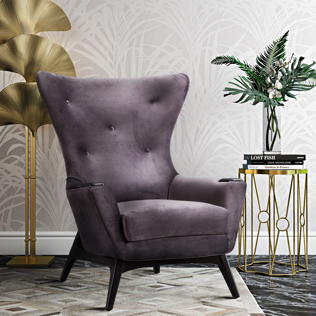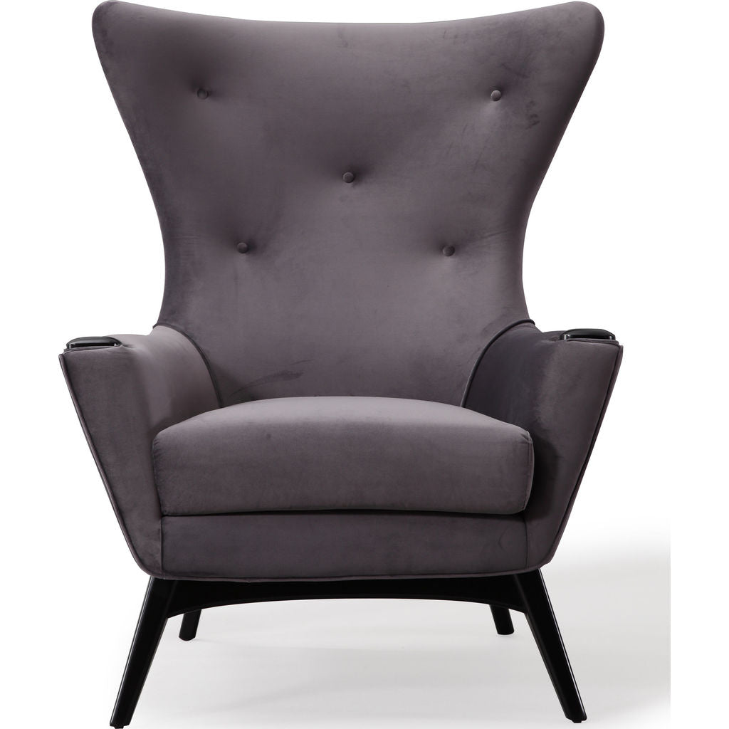 Embrace the Elegance of the TOV Furniture Charlie Grey Velvet Chair. A classic curved wingback chair that is good for anytime, anywhere. Made with incredibly soft yet durable velvet upholstery the chair has Mid-Century style black Birch legs. This comfortable chair is handmade and will add a trendy element to any room in your home.