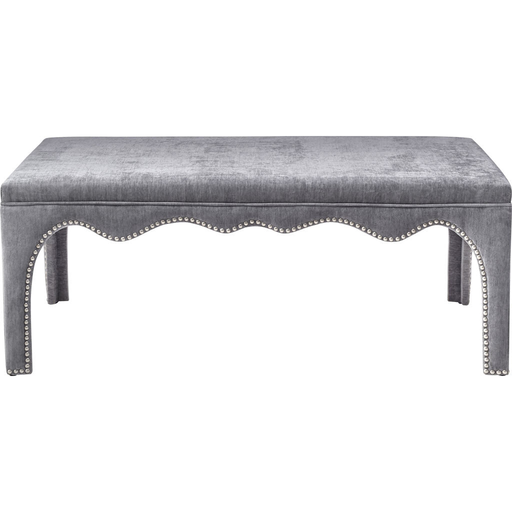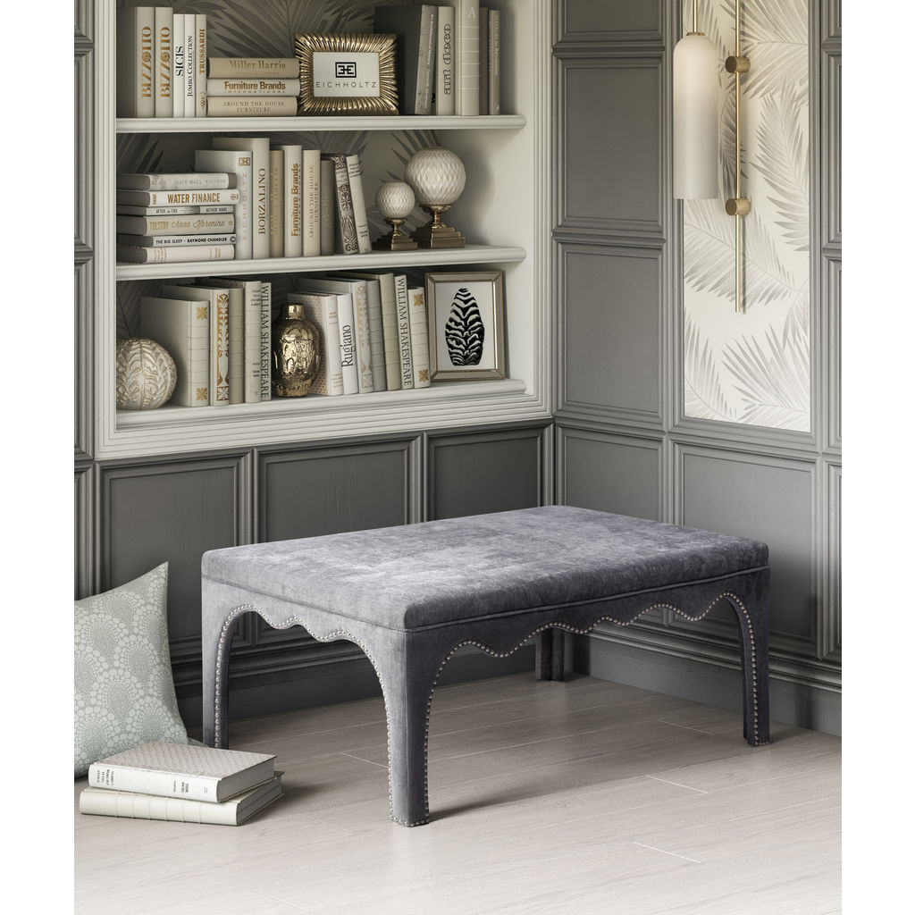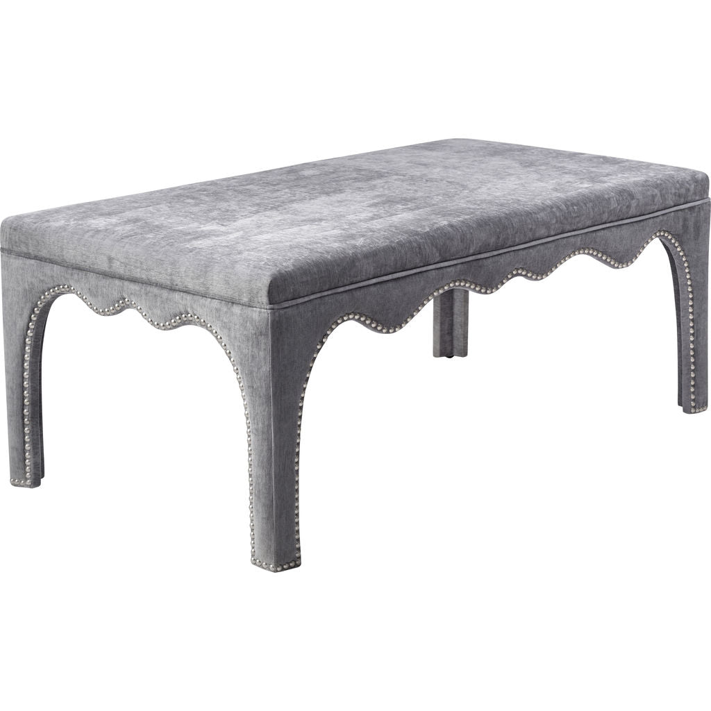 The TOV Furniture Ditmas Grey Bench/Table doubles as seating and a cocktail table. This table has feminine elements with the scalloped edge and nailhead trim. This piece is functional and beautiful, perfect for your living room to use as a coffee table or a bench.